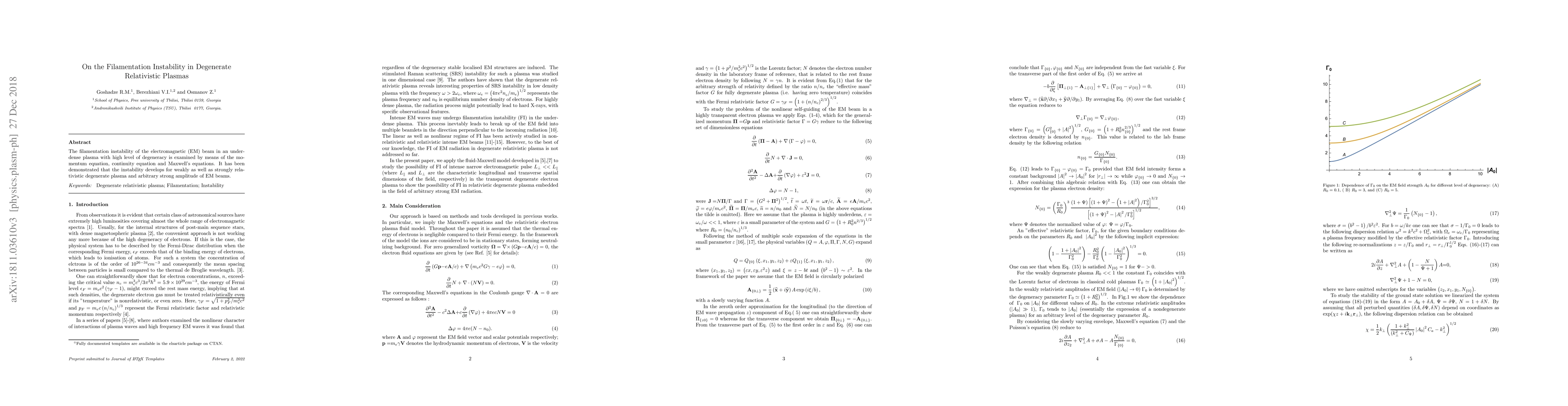 The filamentation instability in degenerate relativistic plasmas is studied, showing it occurs in both weakly and strongly relativistic conditions for varying EM beam amplitudes.
