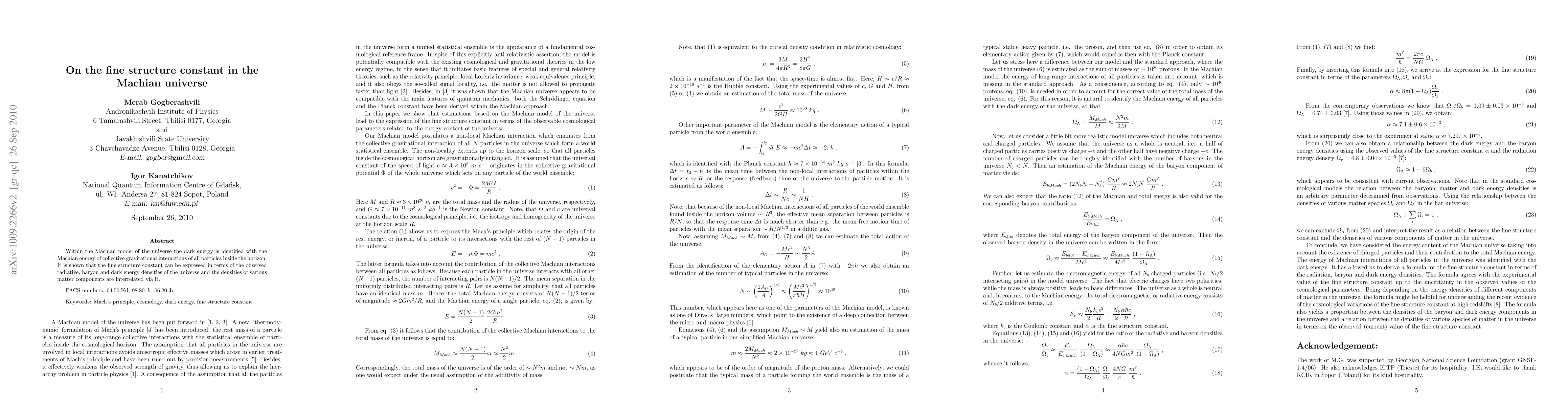 This paper explores the Machian universe model where dark energy is equated to collective gravitational interactions. It demonstrates that the fine structure constant can be derived from observed densities of radiative, baryon, and dark energy, linking various matter components through it.