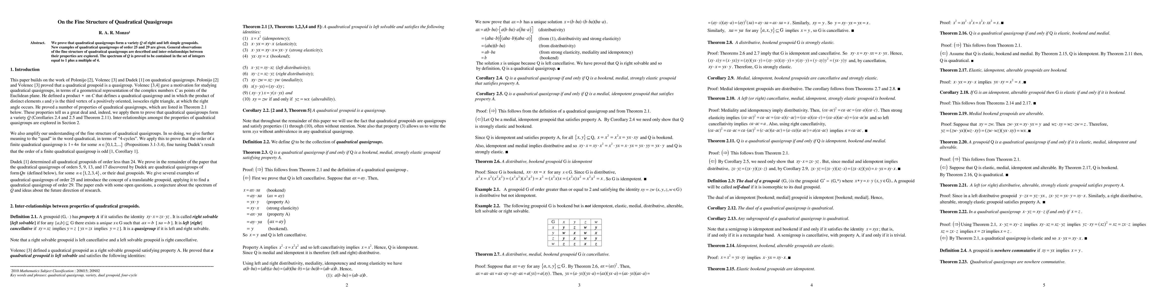Quadratical quasigroups are shown to constitute a variety Q of right and left simple groupoids. New examples of such quasigroups of orders 25 and 29 are introduced, and their fine structure and inter-relationships are thoroughly examined, revealing that the spectrum of Q is confined to integers that are 1 plus a multiple of 4.