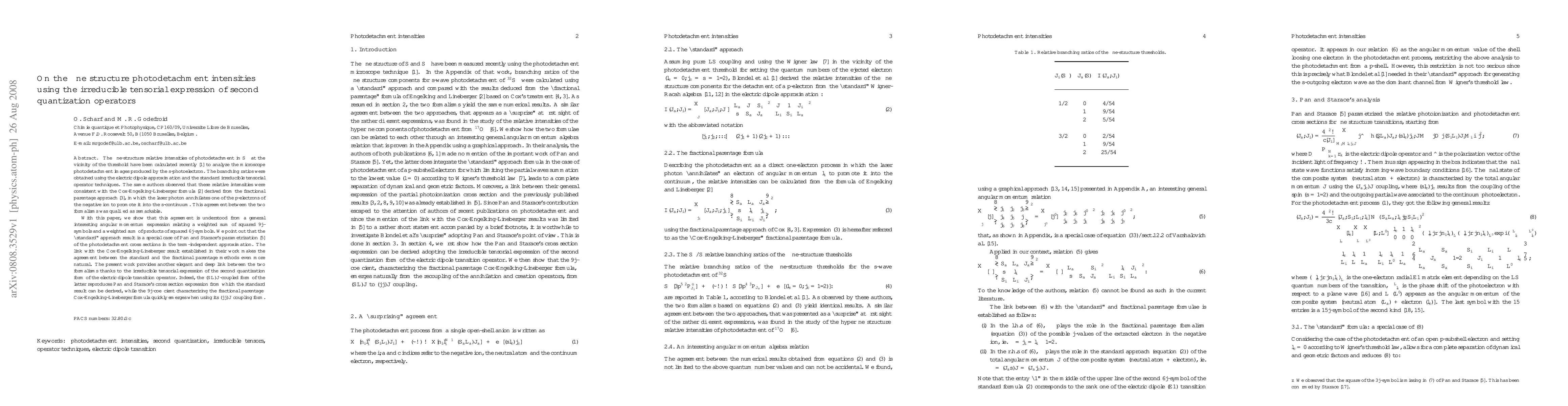 The branching ratios of the fine-structure photodetachment intensities of S- have been calculated by Blondel et al. (J. Phys. B 39(2006)1409) using the standard irreducible tensorial operator techniques. They observed that the relative intensities were consistent with the well known Engelking-Lineberger formula (Phys. Rev. A19(1979)149) derived from the fractional parentage approach, and qualified this agreement as remarkable. In the present paper, we show that it can be understood from a general interesting angular momentum expression relating a weighted sum of squared 9j-symbols and a weighted sum of products of squared 6j-symbols. We also point out that the standard approach result is a special case of the photodetachment cross sections parametrization by Pan and Starace (Phys. Rev. A47(1993)295) who already established the link with the Engelking-Lineberger's result. The present work provides a new, elegant and deep link between the two formalisms, thanks to the irreducible tensorial expression of the second quantization form of the electric dipole transition operator.