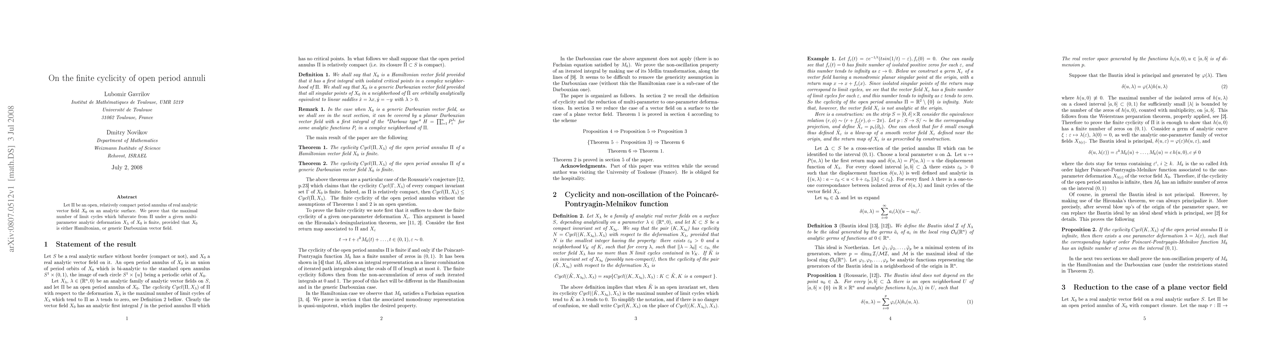 This paper proves that the maximal number of limit cycles that can bifurcate from an open period annulus under a multi-parameter analytic deformation of a real analytic vector field is finite, provided the vector field is either Hamiltonian or a generic Darbouxian vector field.