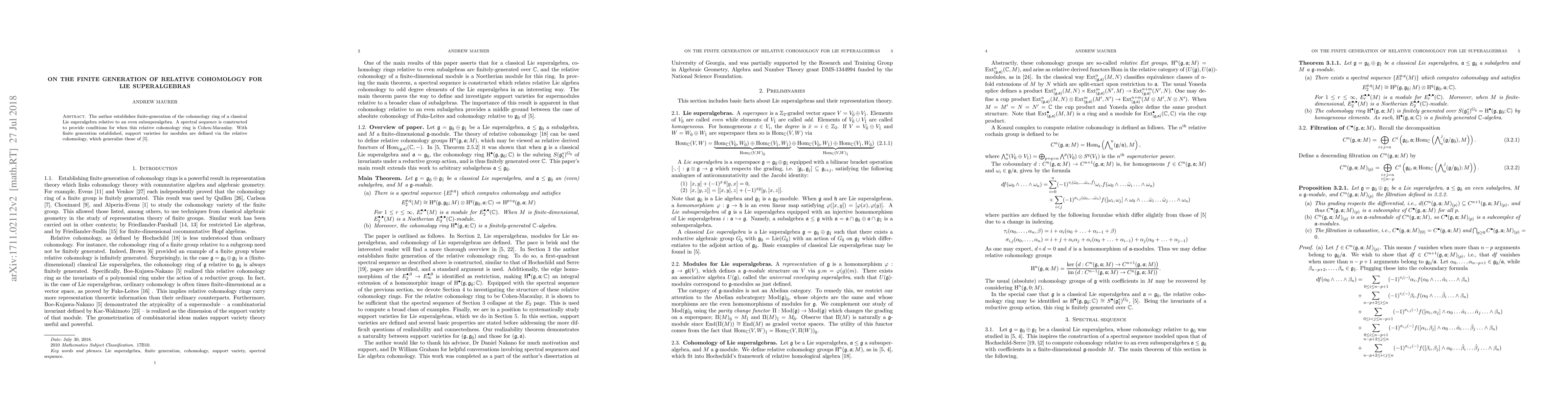 The author establishes finite-generation of the cohomology ring of a classical Lie superalgebra relative to an even subsuperalgebra. A spectral sequence is constructed to provide conditions for when this relative cohomology ring is Cohen-Macaulay. With finite generation established, support varieties for modules are defined via the relative cohomology, which generalize those of [BKN-1]
