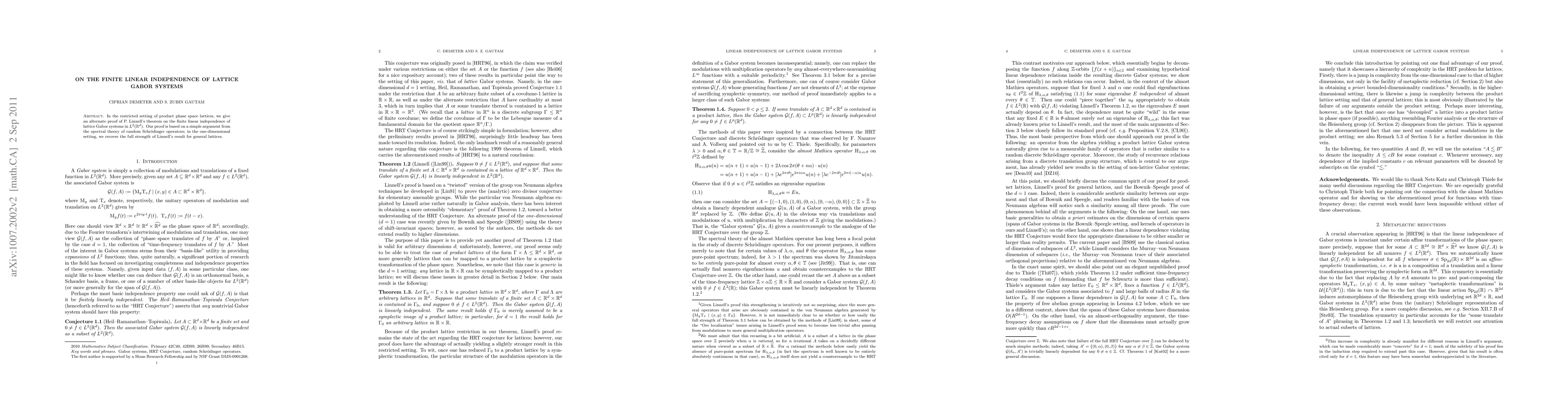 In the restricted setting of product phase space lattices, we give an alternate proof of P. Linnell's theorem on the finite linear independence of lattice Gabor systems in $L^2(\mathbb R^d)$. Our proof is based on a simple argument from the spectral theory of random Schr\"odinger operators; in the one-dimensional setting, we recover the full strength of Linnell's result for general lattices.