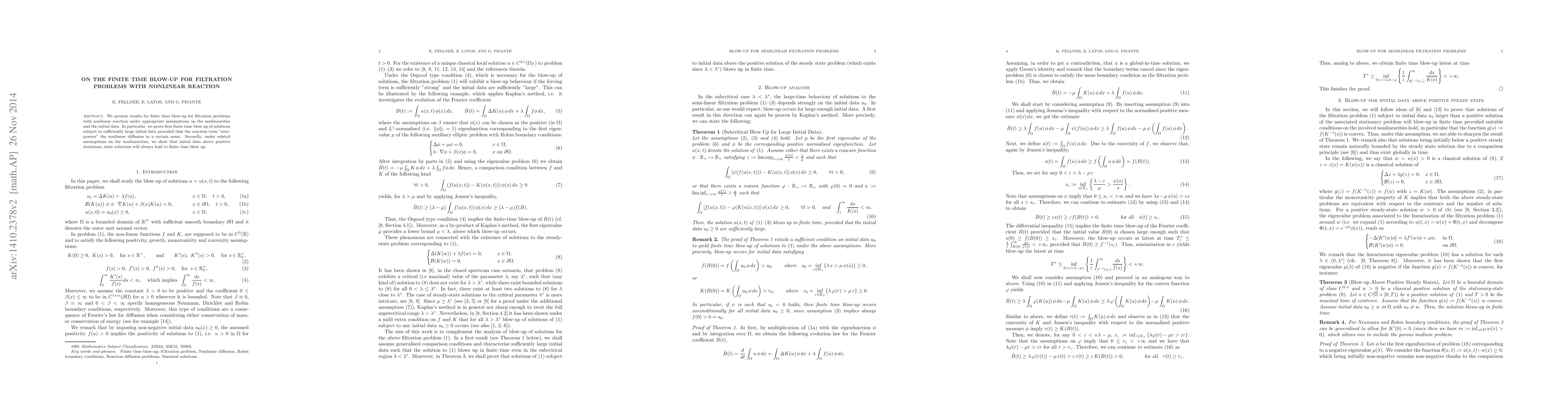 This paper investigates the finite time blow-up phenomena in filtration problems with nonlinear reaction, proving that sufficiently large initial data can lead to solution blow-up when the reaction term dominates diffusion. It also shows that initial data exceeding positive stationary states will result in finite time blow-up under certain nonlinearity conditions.