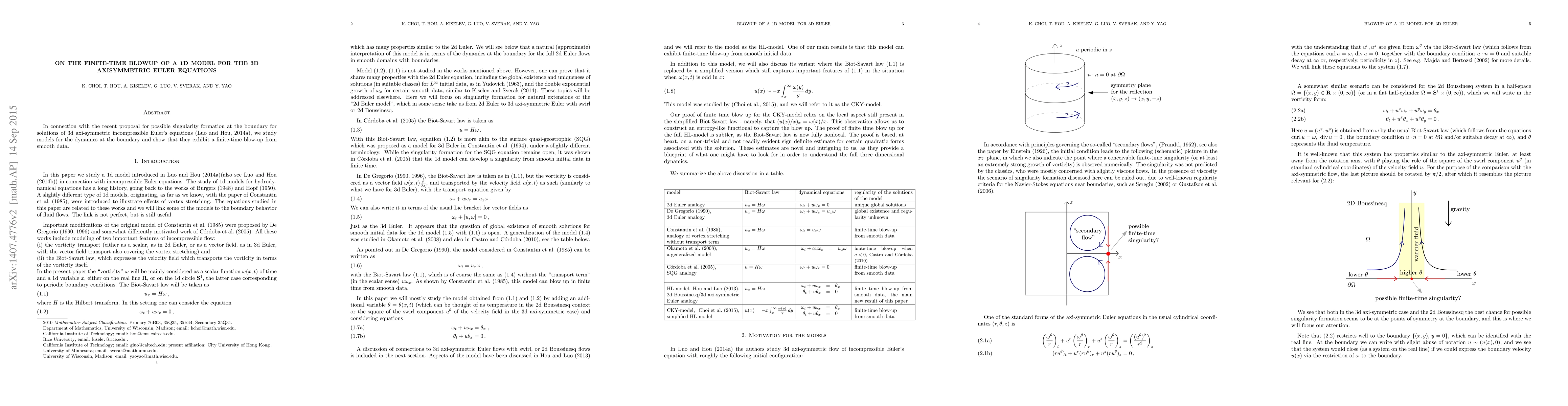 This paper investigates 1D models for the dynamics at the boundary of 3D axisymmetric Euler equations, demonstrating that these models exhibit finite-time blow-up from smooth initial conditions, supporting the hypothesis of potential singularity formation.
