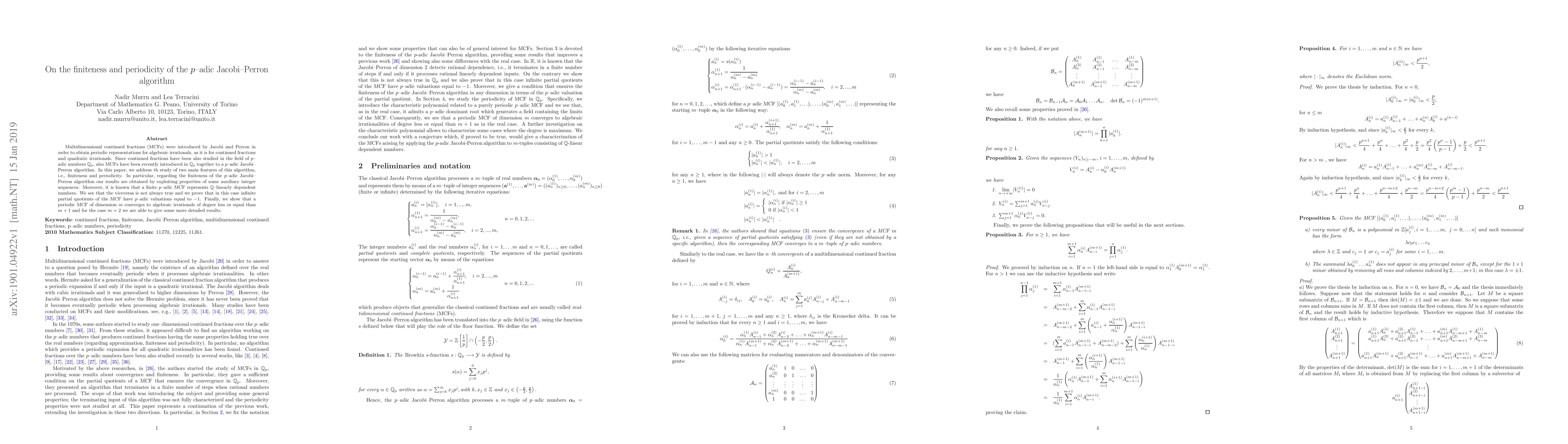 Multidimensional continued fractions (MCFs) were introduced by Jacobi and Perron in order to obtain periodic representations for algebraic irrationals, as it is for continued fractions and quadratic irrationals. Since continued fractions have been also studied in the field of $p$--adic numbers $\mathbb Q_p$, also MCFs have been recently introduced in $\mathbb Q_p$ together to a $p$--adic Jacobi--Perron algorithm. In this paper, we address th study of two main features of this algorithm, i.e., finiteness and periodicity. In particular, regarding the finiteness of the $p$--adic Jacobi--Perron algorithm our results are obtained by exploiting properties of some auxiliary integer sequences. Moreover, it is known that a finite $p$--adic MCF represents $\mathbb Q$--linearly dependent numbers. We see that the viceversa is not always true and we prove that in this case infinite partial quotients of the MCF have $p$--adic valuations equal to $-1$. Finally, we show that a periodic MCF of dimension $m$ converges to algebraic irrationals of degree less or equal than $m+1$ and for the case $m=2$ we are able to give some more detailed results.