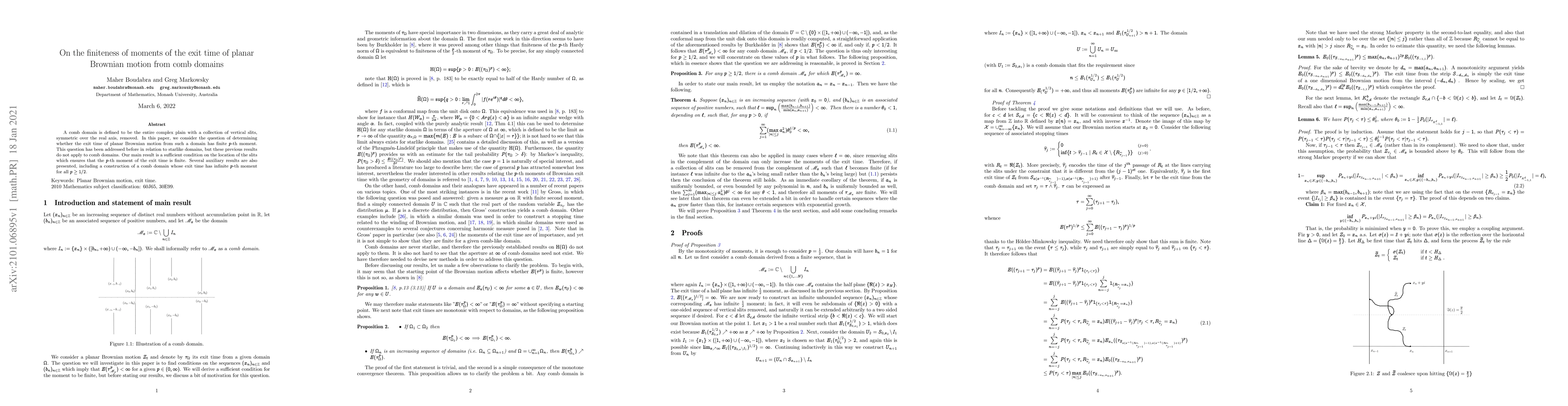 This paper investigates the finiteness of the $p$-th moment of the exit time for planar Brownian motion from comb domains, which are the complex plane with symmetric vertical slits removed. The authors establish a sufficient condition for the finiteness of these moments and construct a specific comb domain where the exit time has infinite $p$-th moment for $p \geq 1/2$.