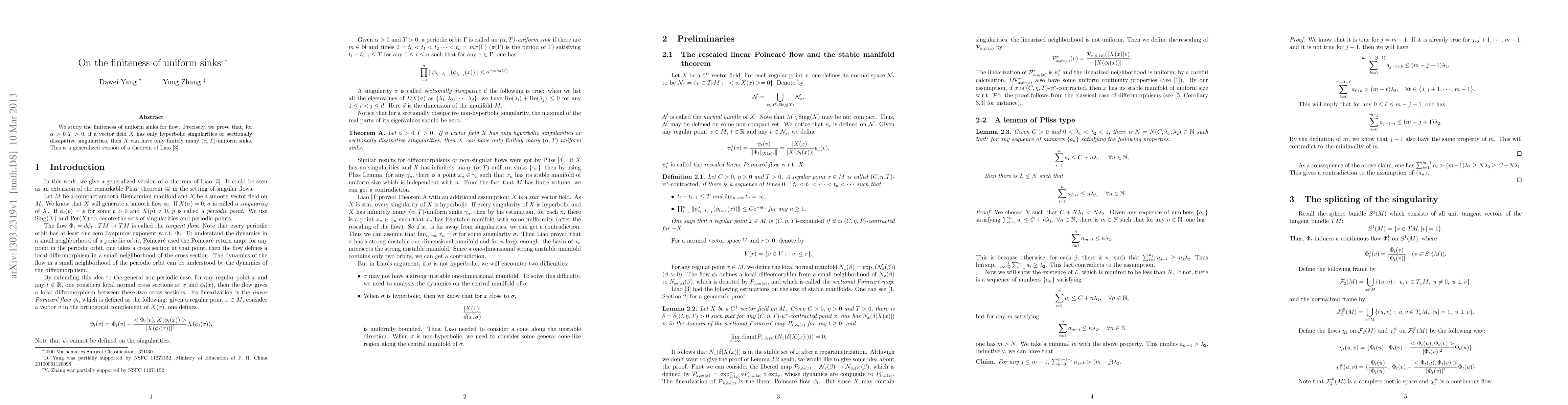 We study the finiteness of uniform sinks for flow. Precisely, we prove that, for $\alpha>0$ $T>0$, if a vector field $X$ has only hyperbolic singularities or sectionally dissipative singularities, then $X$ can have only finitely many $(\alpha,T)$-uniform sinks. This is a generalized version of a theorem of Liao