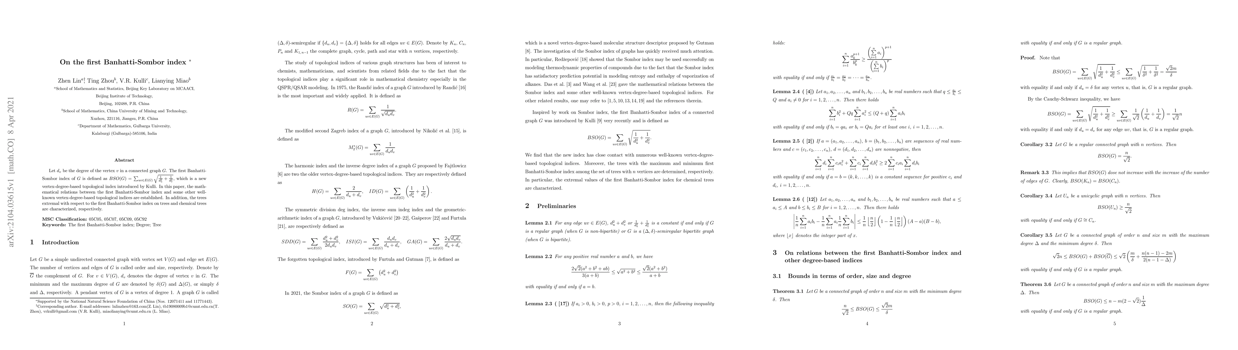 Let $d_v$ be the degree of the vertex $v$ in a connected graph $G$. The first Banhatti-Sombor index of $G$ is defined as $BSO(G) =\sum_{uv\in E(G)}\sqrt{\frac{1}{d^2_u}+\frac{1}{d^2_v}}$, which is a new vertex-degree-based topological index introduced by Kulli. In this paper, the mathematical relations between the first Banhatti-Sombor index and some other well-known vertex-degree-based topological indices are established. In addition, the trees extremal with respect to the first Banhatti-Sombor index on trees and chemical trees are characterized, respectively.