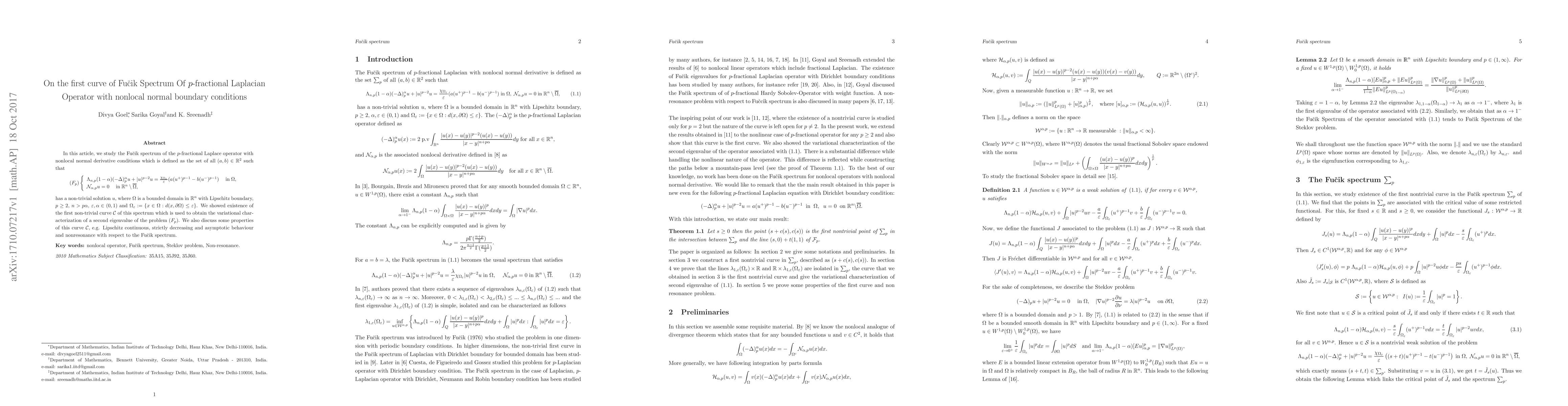In this article, we study the Fu\v{c}ik spectrum of the $p$-fractional Laplace operator with nonlocal normal derivative conditions which is defined as the set of all $(a,b)\in \mb R^2$ such that $$ \mc (F_p)\left\{ \begin{array}{lr} \Lambda_{n,p}(1-\al)(-\Delta)_{p}^{\al} u + |u|^{p-2}u = \frac{\chi_{\Omega_\e}}{\e} (a (u^{+})^{p-1} - b (u^{-})^{p-1}) \;\quad \text{in}\; \Omega,\quad \\ \mc{N}_{\al,p} u = 0 \; \quad \mbox{in}\; \mb R^n \setminus \overline{\Omega}, \end{array} \right. $$ has a non-trivial solution $u$, where $\Omega$ is a bounded domain in $\mb R^n$ with Lipschitz boundary, $p \geq 2$, $n>p \al $, $\e, \al \in(0,1)$ and $\Omega{_\e}:=\{x \in \Omega: d(x,\pa \Omega)\leq \e \}$. We showed existence of the first non-trivial curve $\mc C$ of this spectrum which is used to obtain the variational characterization of a second eigenvalue of the problem $\mc (F_p)$. We also discuss some properties of this curve $\mc C$, e.g. Lipschitz continuous, strictly decreasing and asymptotic behaviour and nonresonance with respect to the Fu\v{c}ik spectrum.