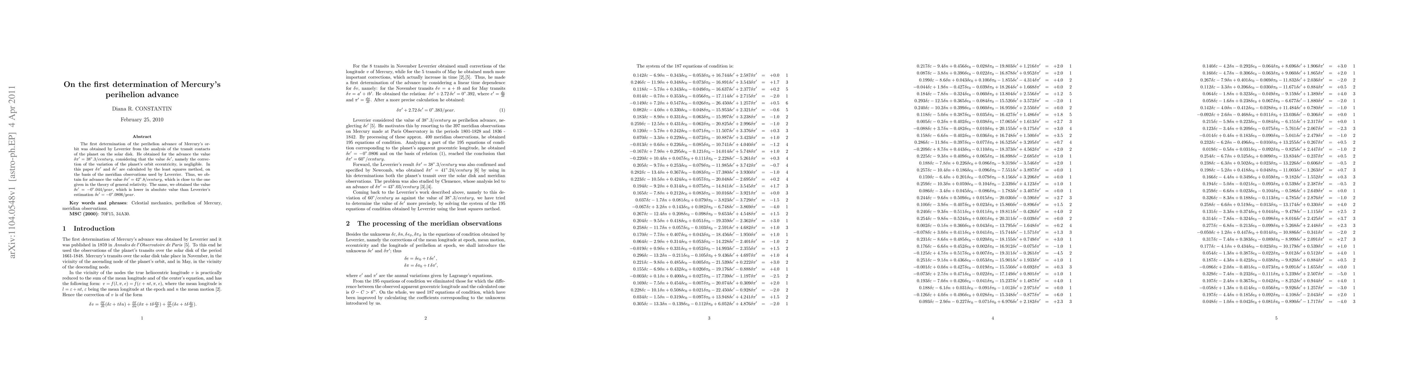 This paper recalculates the perihelion advance of Mercury's orbit using modern least squares methods on historical observations, finding an advance of 42".8/century, closer to the value predicted by general relativity, and a smaller correction to orbital eccentricity, \delta e' = -0".044/year, compared to Leverrier's original estimate.