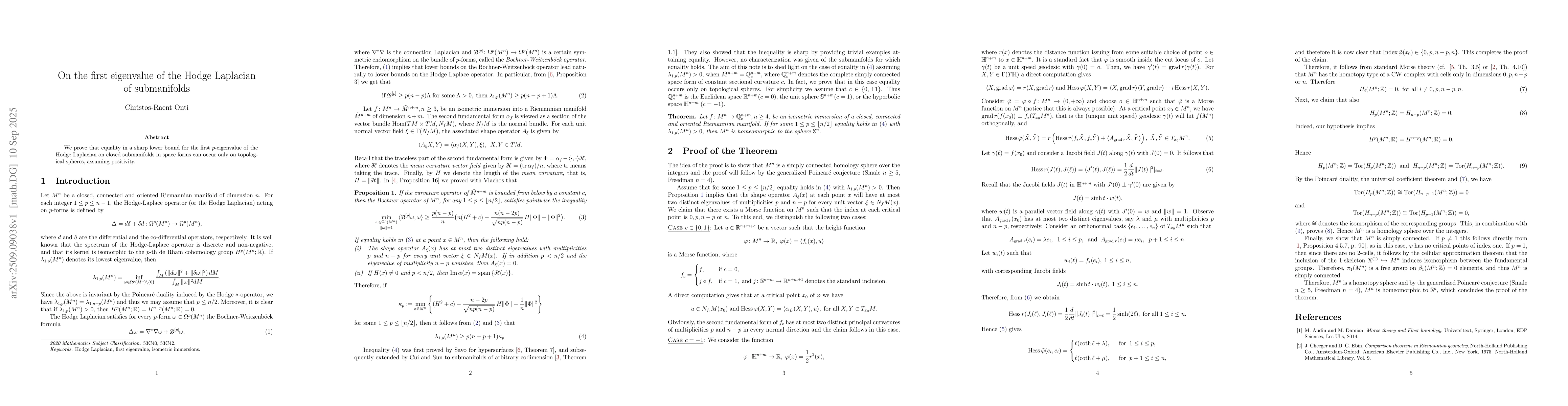 We prove that equality in a sharp lower bound for the first $p$-eigenvalue of the Hodge Laplacian on closed submanifolds in space forms can occur only on topological spheres, assuming positivity.