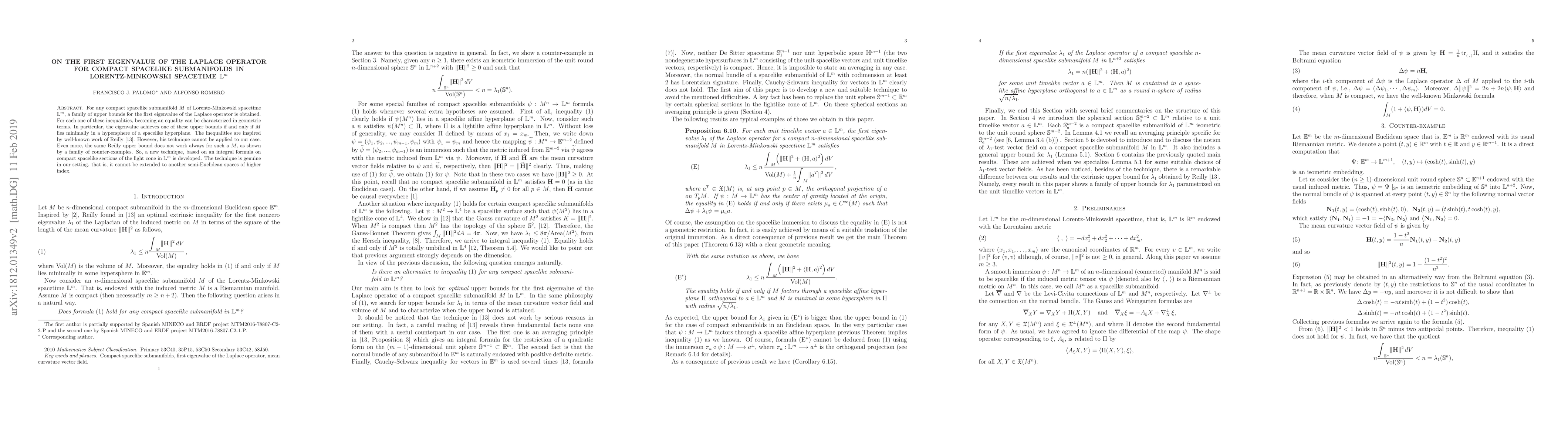 Researchers found that a known upper bound for the first eigenvalue of the Laplace operator does not work for compact spacelike submanifolds in Lorentz-Minkowski spacetime. They developed new techniques to prove family of extrinsic upper bounds, which can be achieved under specific geometric conditions.