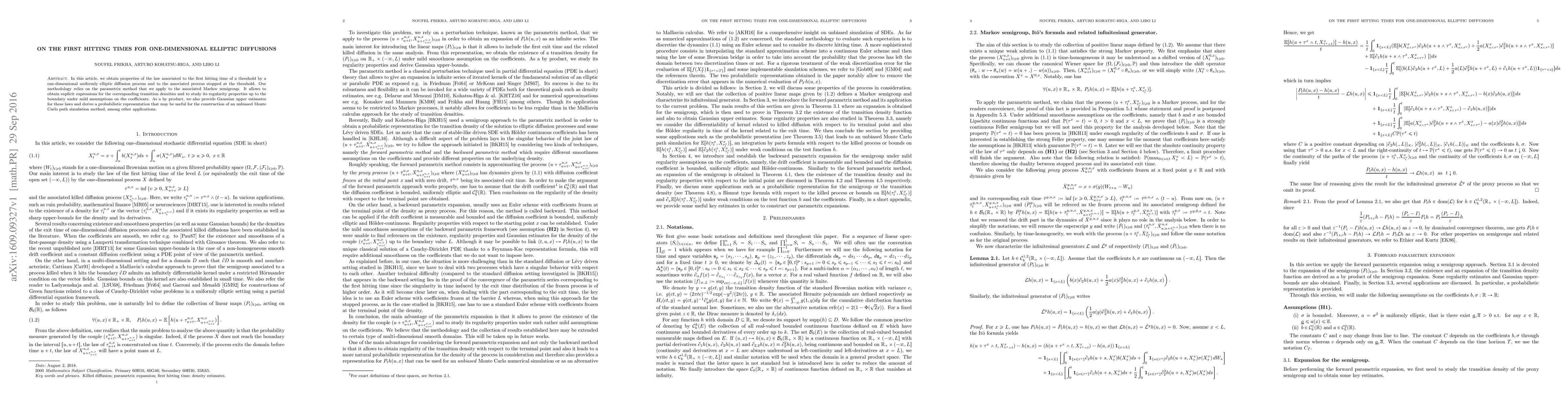 This paper investigates the first hitting times of a threshold by a one-dimensional elliptic diffusion process, employing the parametrix method to derive explicit transition densities and study their regularity. It also provides Gaussian upper estimates and a probabilistic representation useful for Monte Carlo simulations.