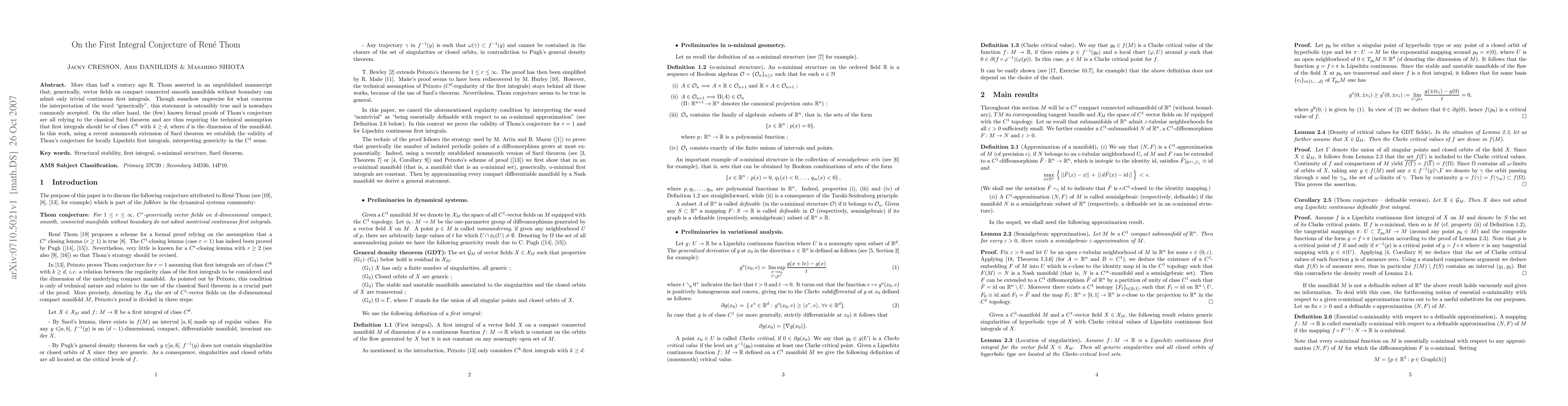 This paper establishes Rene Thom's conjecture on the first integral of vector fields on smooth manifolds without relying on the classical $C^{k}$ assumption, instead using a recent nonsmooth extension of the Sard theorem to validate the conjecture for locally Lipschitz first integrals.
