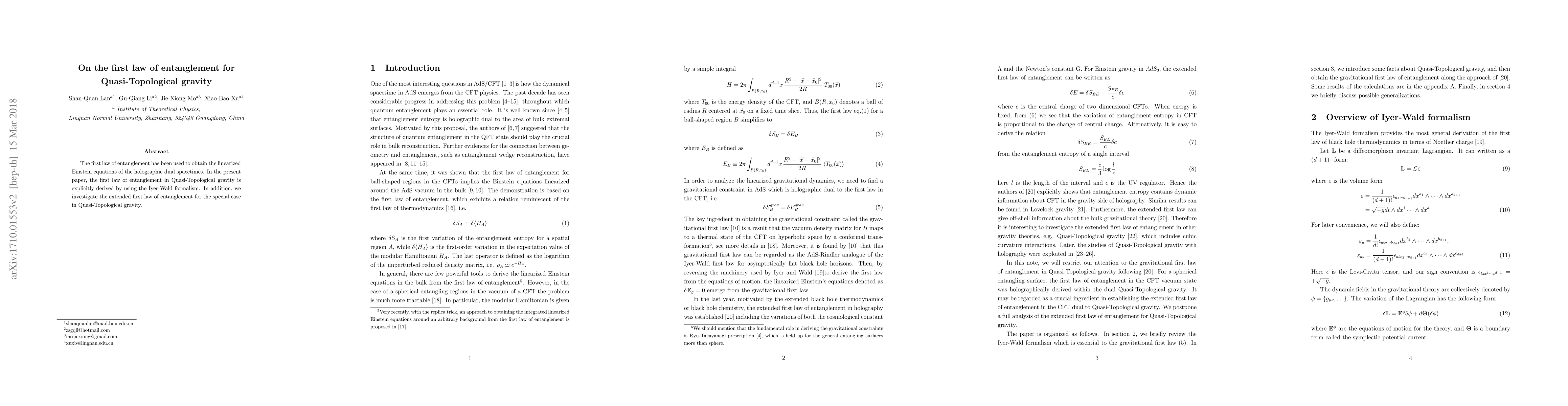The first law of entanglement has been used to obtain the linearized Einstein equations of the holographic dual spacetimes. In the present paper, the first law of entanglement in quasi-topological gravity is explicitly derived by using the Iyer-Wald formalism. In addition, we investigate the extended first law of entanglement for the special case in Quasi-Topological gravity.