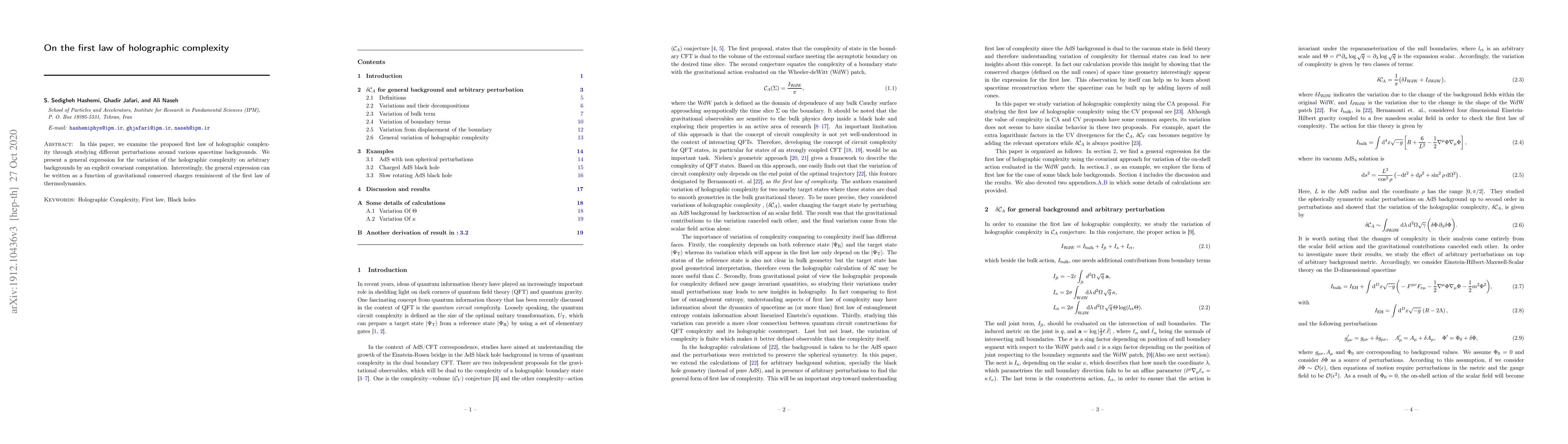 In this paper, we examine the proposed first law of holographic complexity through studying different perturbations around various spacetime backgrounds. We present a general expression for the variation of the holographic complexity on arbitrary backgrounds by an explicit covariant computation. Interestingly, the general expression can be written as a function of gravitational conserved charges reminiscent of the first law of thermodynamics.
