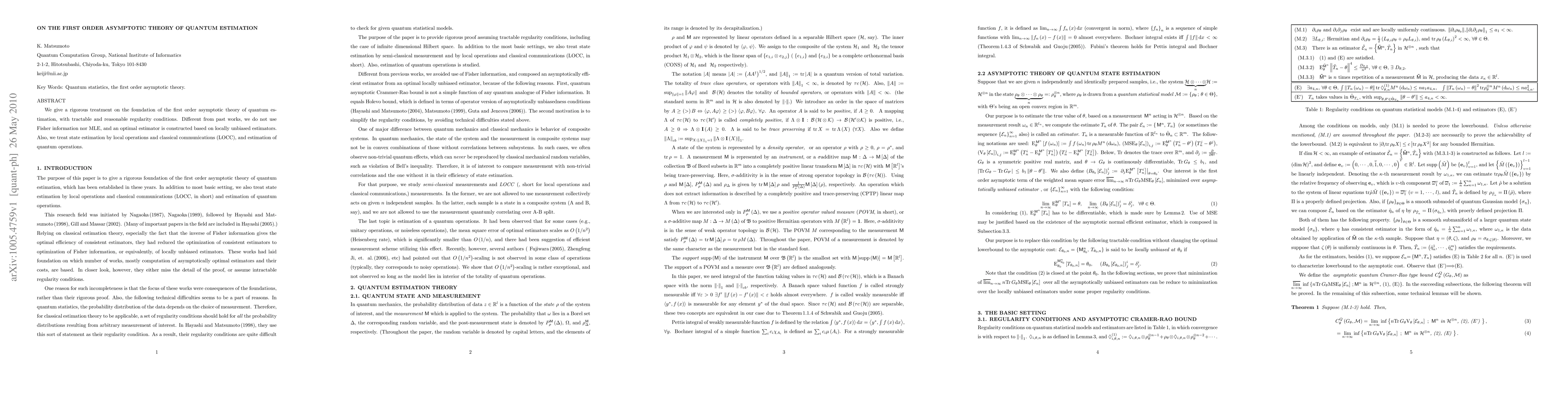 This paper develops a first-order asymptotic theory for quantum estimation without relying on Fisher information or MLE, constructing an optimal estimator from locally unbiased estimators. It also addresses state estimation via LOCC and the estimation of quantum operations.