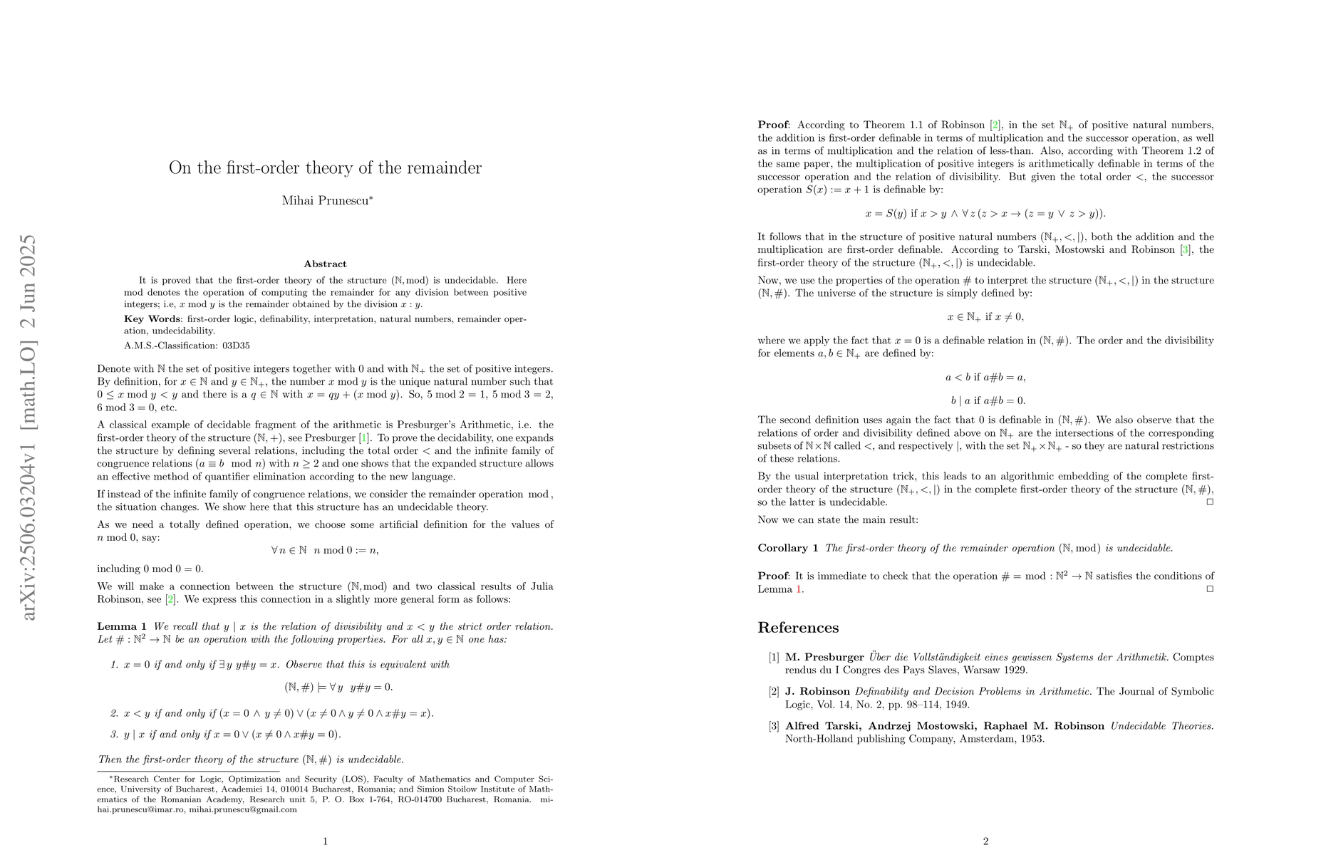 The paper presents a reduction proof showing that the first-order theory of remainders shares the undecidability property with other classically undecidable problems.
