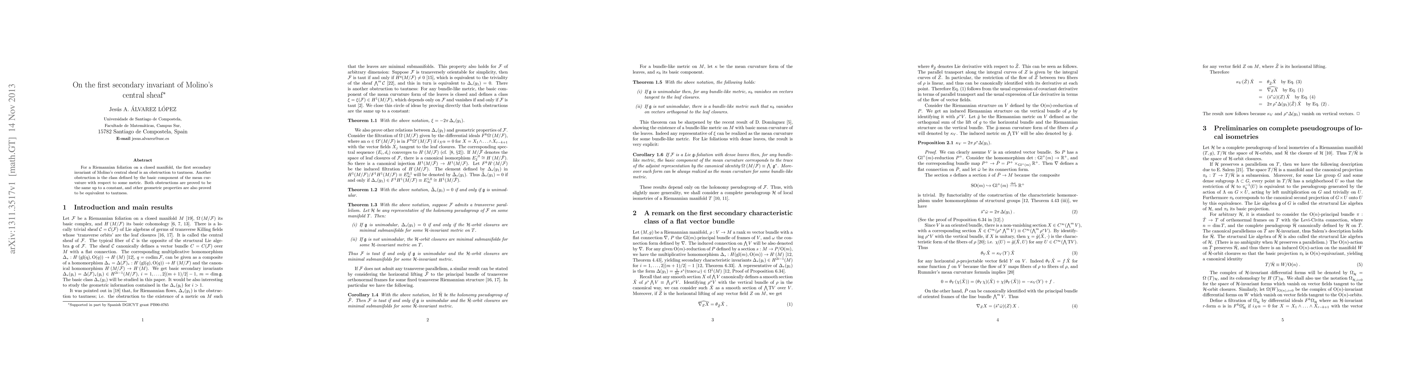 The paper presents detailed proofs and equivalences regarding the first secondary invariant of Molino's central sheaf and its relation to geometric properties and obstructions to tautness in Riemannian foliations.