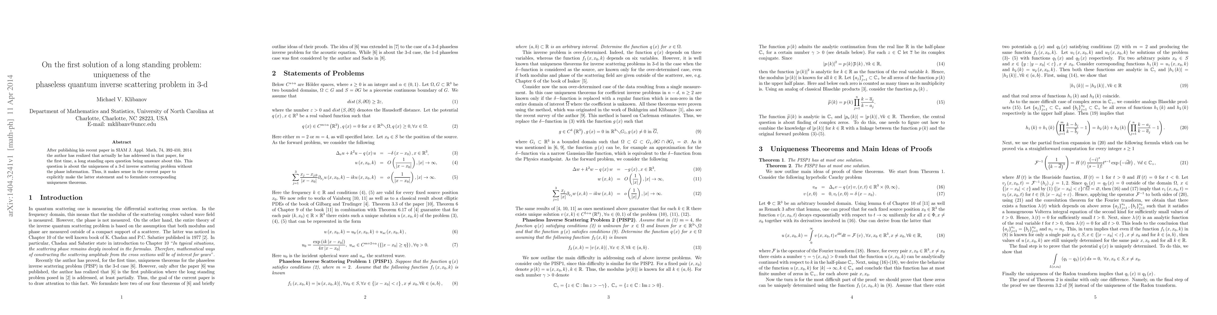 This paper establishes the first solution to the long-standing problem of the uniqueness of the 3-d phaseless quantum inverse scattering problem. It clarifies and formalizes the uniqueness theorems previously addressed in an earlier publication, now recognized as the first to tackle this open question.