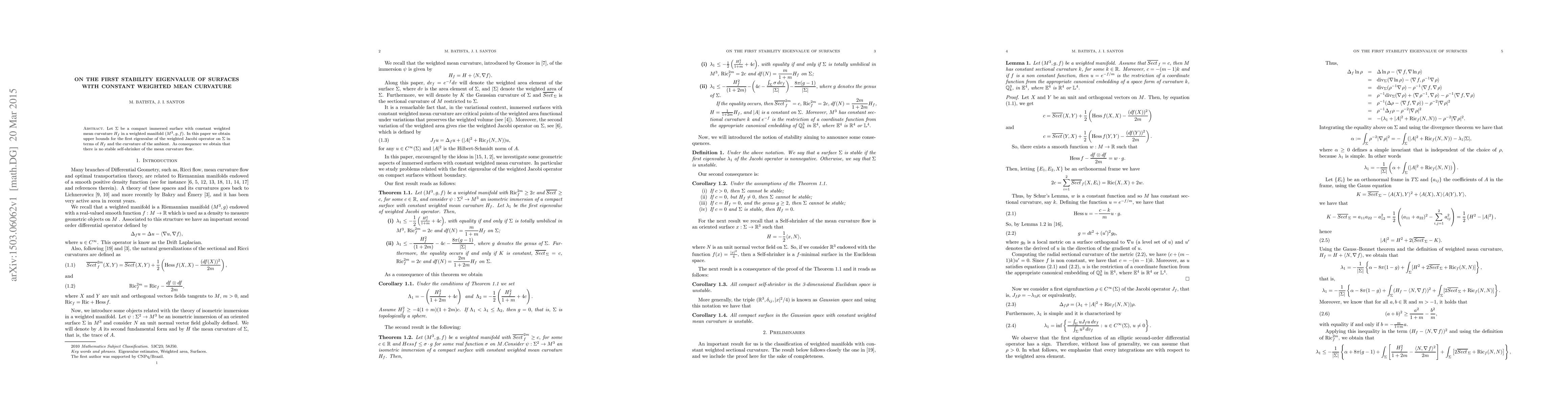 This paper investigates the first stability eigenvalue of compact surfaces with constant weighted mean curvature in a weighted 3-manifold, deriving upper bounds in terms of the surface's weighted mean curvature and the ambient curvature. It concludes that no stable self-shrinkers exist under the mean curvature flow.
