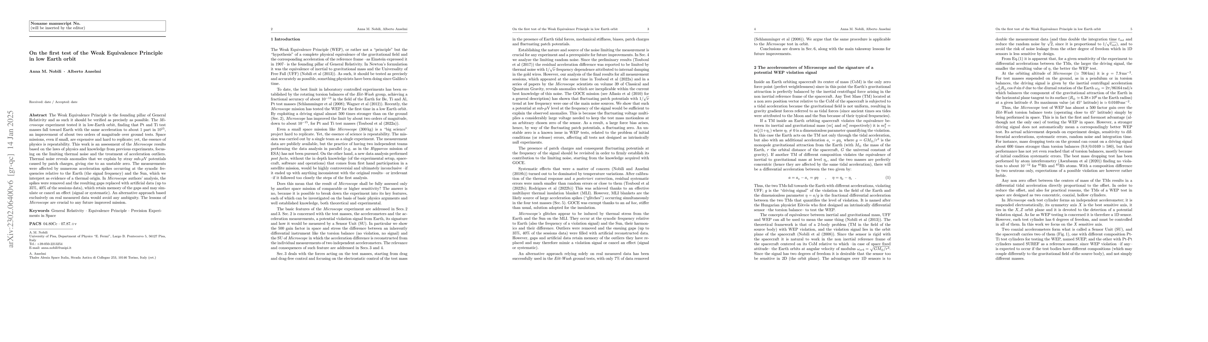 The Microscope experiment in low Earth orbit tested the Weak Equivalence Principle with unprecedented precision, finding no significant difference in the acceleration of Pt and Ti test masses toward Earth. However, anomalies in thermal noise and data gaps due to acceleration spikes suggest potential sources of error in the analysis, emphasizing the need for an alternative approach based solely on real measurements for future missions.