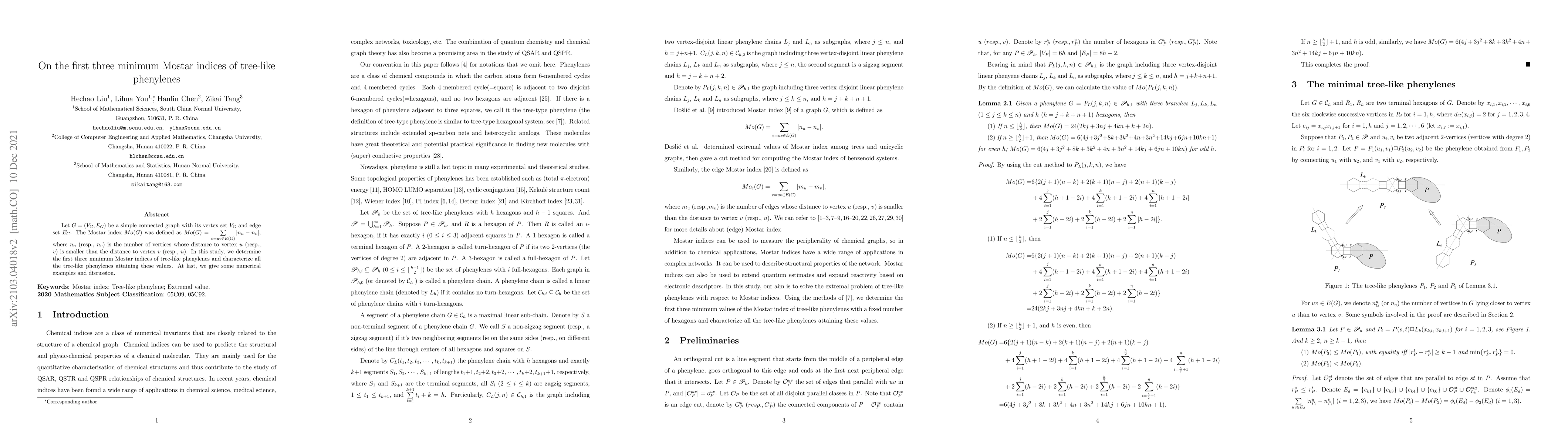 This paper determines the first three minimum Mostar indices of tree-like phenylenes, a class of molecular graphs, and characterizes the structures that achieve these indices. It also provides numerical examples and discussions to illustrate the findings.