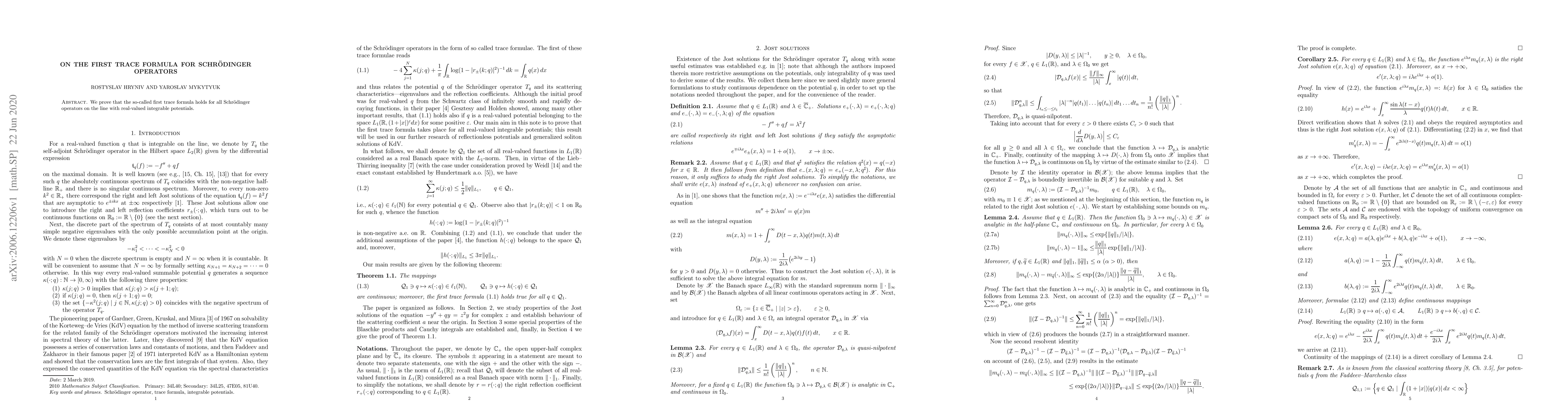 The paper presents a rigorous proof of the first trace formula for Schrödinger operators with real-valued integrable potentials, establishing a connection between the spectral properties and the asymptotic behavior of Jost solutions.