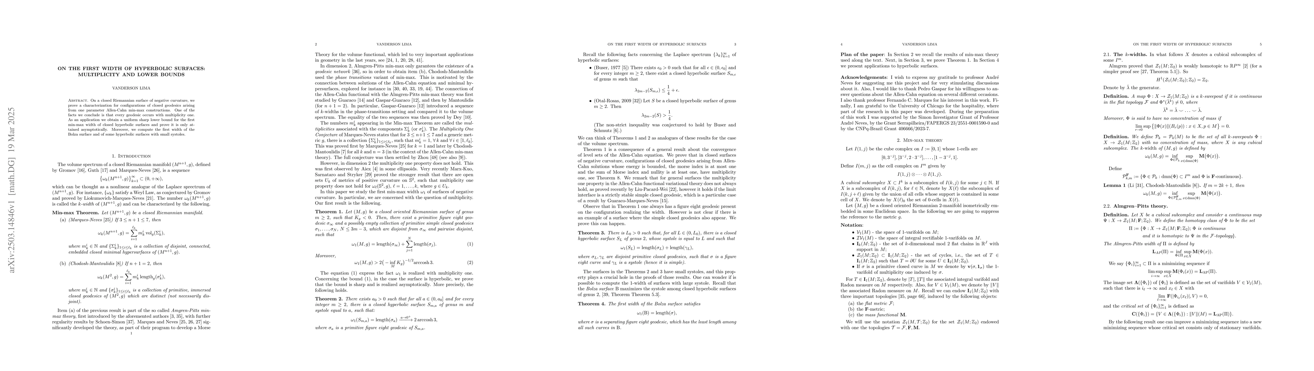 The paper introduces a novel method for characterizing geodesic configurations on hyperbolic surfaces using Allen-Cahn min-max constructions, leading to a uniform lower bound for the first min-max width.