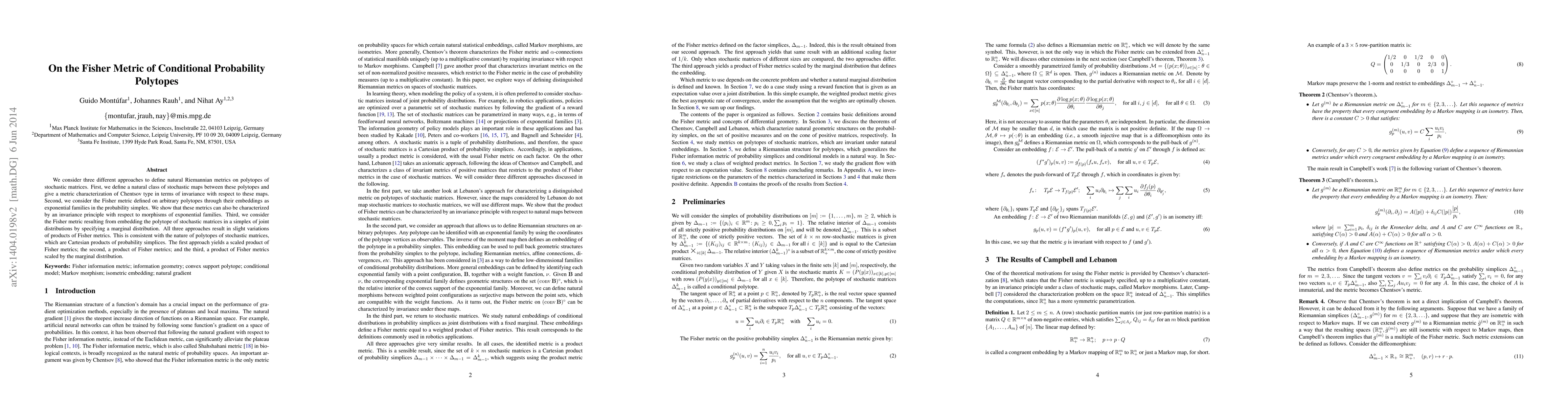 We consider three different approaches to define natural Riemannian metrics on polytopes of stochastic matrices. First, we define a natural class of stochastic maps between these polytopes and give a metric characterization of Chentsov type in terms of invariance with respect to these maps. Second, we consider the Fisher metric defined on arbitrary polytopes through their embeddings as exponential families in the probability simplex. We show that these metrics can also be characterized by an invariance principle with respect to morphisms of exponential families. Third, we consider the Fisher metric resulting from embedding the polytope of stochastic matrices in a simplex of joint distributions by specifying a marginal distribution. All three approaches result in slight variations of products of Fisher metrics. This is consistent with the nature of polytopes of stochastic matrices, which are Cartesian products of probability simplices. The first approach yields a scaled product of Fisher metrics; the second, a product of Fisher metrics; and the third, a product of Fisher metrics scaled by the marginal distribution.