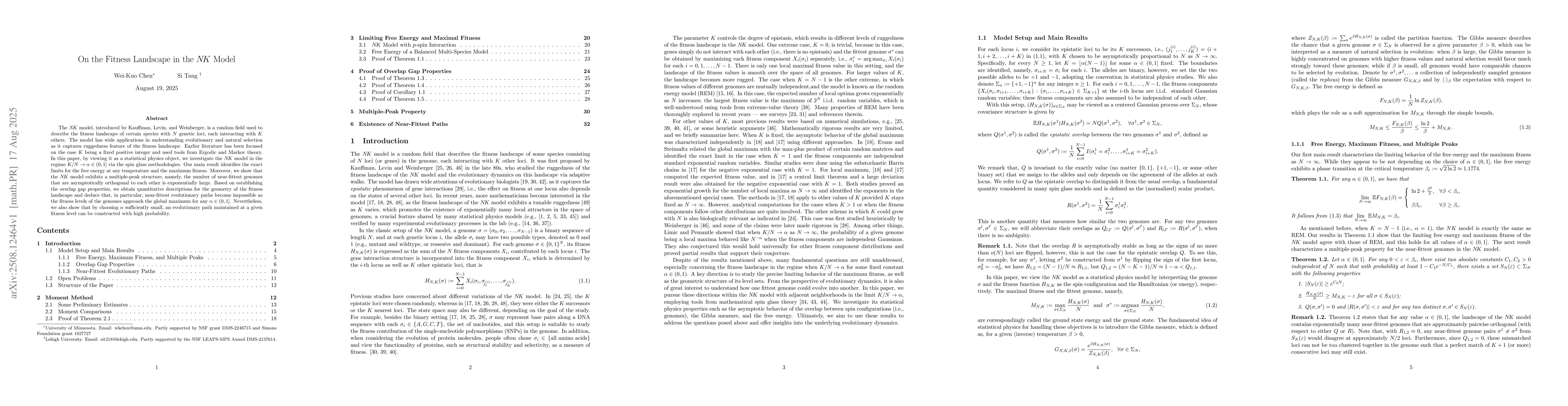 The $NK$ model, introduced by Kauffman, Levin, and Weinberger, is a random field used to describe the fitness landscape of certain species with $N$ genetic loci, each interacting with $K$ others. The model has wide applications in understanding evolutionary and natural selection as it captures ruggedness feature of the fitness landscape. Earlier literature has been focused on the case $K$ being a fixed positive integer and used tools from Ergodic and Markov theory. In this paper, by viewing it as a statistical physics object, we investigate the $NK$ model in the regime $K/N\to\alpha \in(0,1]$ via the spin glass methodologies. Our main result identifies the exact limits for the free energy at any temperature and the maximum fitness. Moreover, we show that the $NK$ model exhibits a multiple-peak structure, namely, the number of near-fittest genomes that are asymptotically orthogonal to each other is exponentially large. Based on establishing the overlap gap properties, we obtain quantitative descriptions for the geometry of the fitness landscape and deduce that, in particular, near-fittest evolutionary paths become impossible as the fitness levels of the genomes approach the global maximum for any $\alpha\in (0,1]$. Nevertheless, we also show that by choosing $\alpha$ sufficiently small, an evolutionary path maintained at a given fitness level can be constructed with high probability.