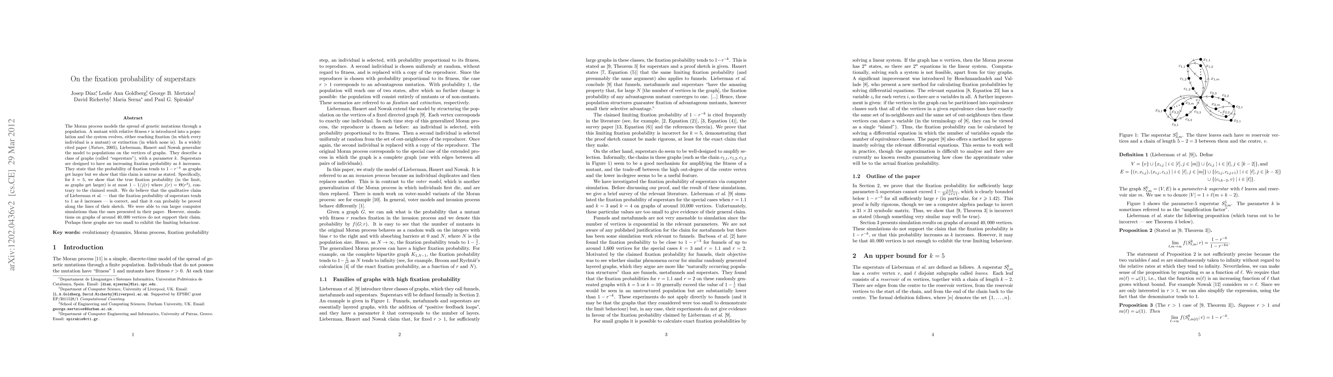 The Moran process models the spread of genetic mutations through a population. A mutant with relative fitness $r$ is introduced into a population and the system evolves, either reaching fixation (in which every individual is a mutant) or extinction (in which none is). In a widely cited paper (Nature, 2005), Lieberman, Hauert and Nowak generalize the model to populations on the vertices of graphs. They describe a class of graphs (called "superstars"), with a parameter $k$. Superstars are designed to have an increasing fixation probability as $k$ increases. They state that the probability of fixation tends to $1-r^{-k}$ as graphs get larger but we show that this claim is untrue as stated. Specifically, for $k=5$, we show that the true fixation probability (in the limit, as graphs get larger) is at most $1-1/j(r)$ where $j(r)=\Theta(r^4)$, contrary to the claimed result. We do believe that the qualitative claim of Lieberman et al.\ --- that the fixation probability of superstars tends to 1 as $k$ increases --- is correct, and that it can probably be proved along the lines of their sketch. We were able to run larger computer simulations than the ones presented in their paper. However, simulations on graphs of around 40,000 vertices do not support their claim. Perhaps these graphs are too small to exhibit the limiting behaviour.