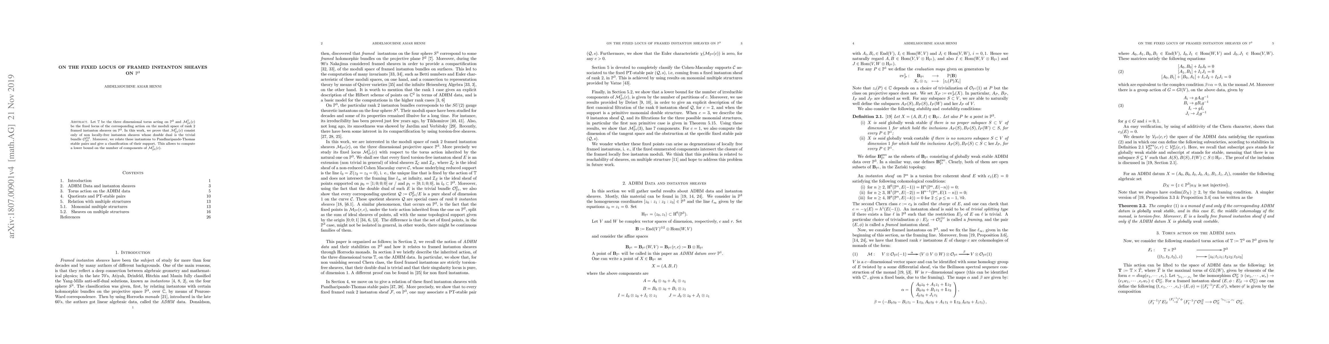 This paper investigates the fixed locus of framed instanton sheaves under the action of a three-dimensional torus on projective space $\mathbb{P}^{3}$. It proves that this fixed locus consists exclusively of non locally-free instanton sheaves with a specific double dual and relates them to Pandharipande-Thomas stable pairs, providing a classification of their support and a lower bound on the number of components.