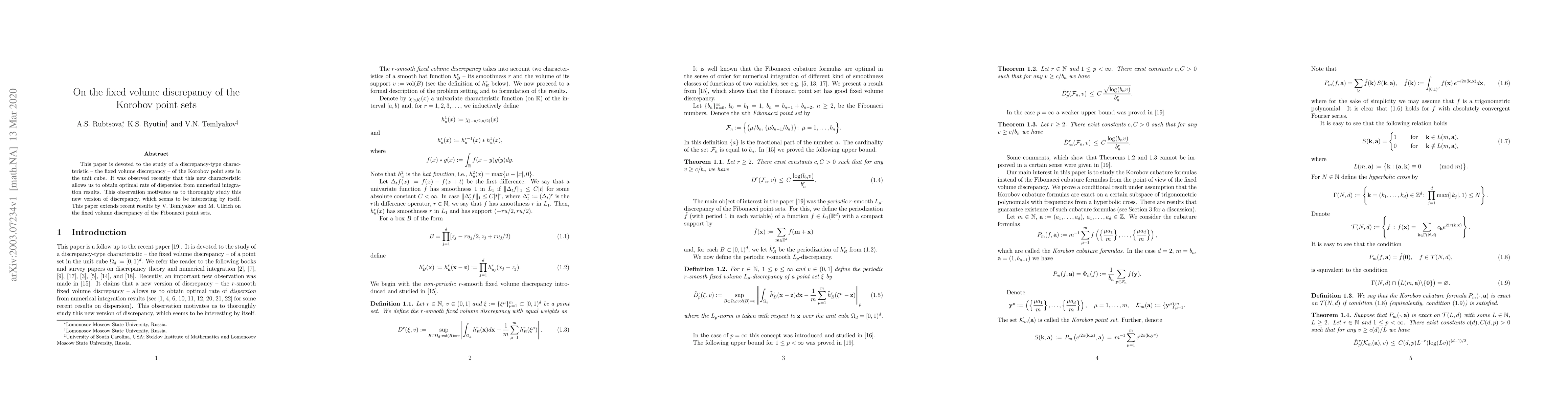 This paper investigates the fixed volume discrepancy of Korobov point sets within the unit cube, revealing its potential for optimal dispersion rates in numerical integration. It extends prior work on the Fibonacci point sets, offering new insights into this discrepancy-type characteristic.