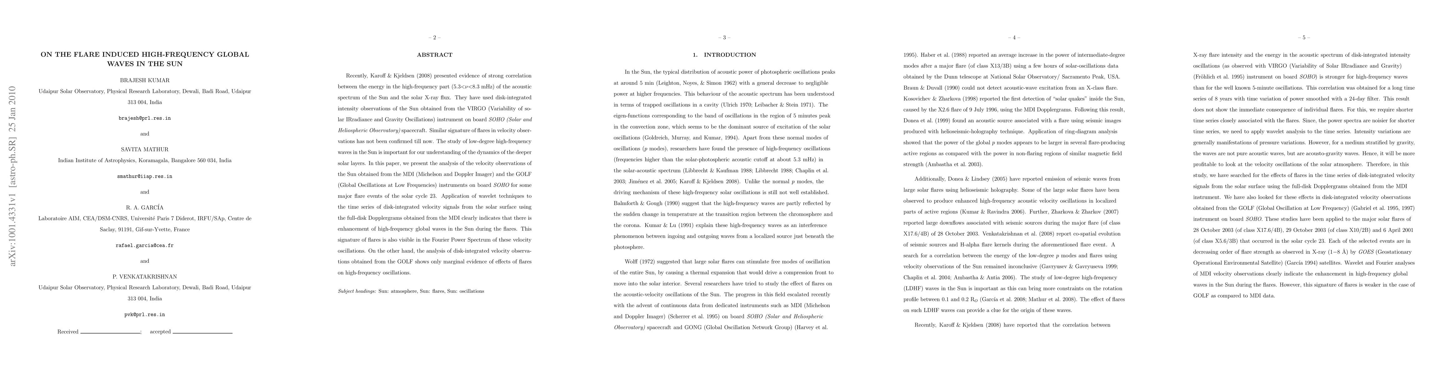 This paper investigates the enhancement of high-frequency global waves in the Sun during major flares, using velocity data from MDI and GOLF on SOHO. The study finds significant flare-induced high-frequency wave signatures in MDI data but only marginal effects in the GOLF data.