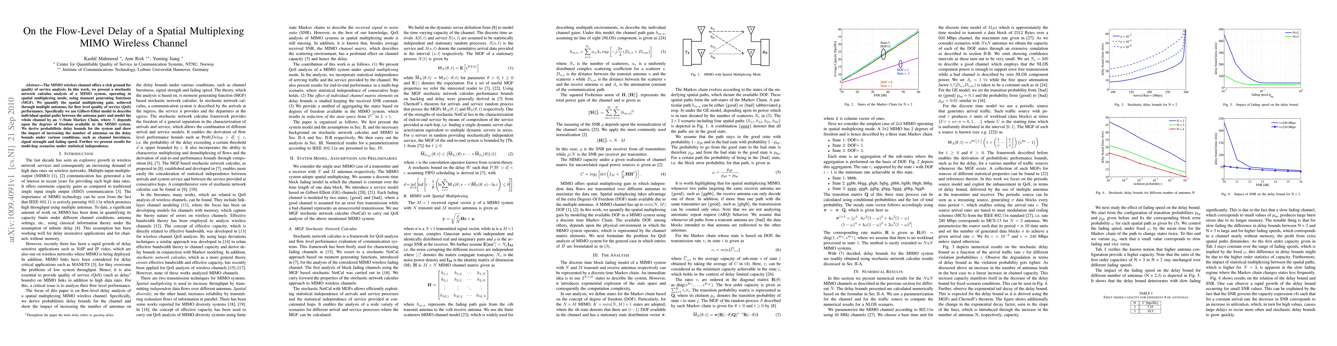 This paper employs stochastic network calculus and moment generating functions to analyze the flow-level delay in a spatial multiplexing MIMO wireless channel. It derives probabilistic delay bounds and examines how the number of antennas affects delay under various conditions, including channel burstiness and fading speed.