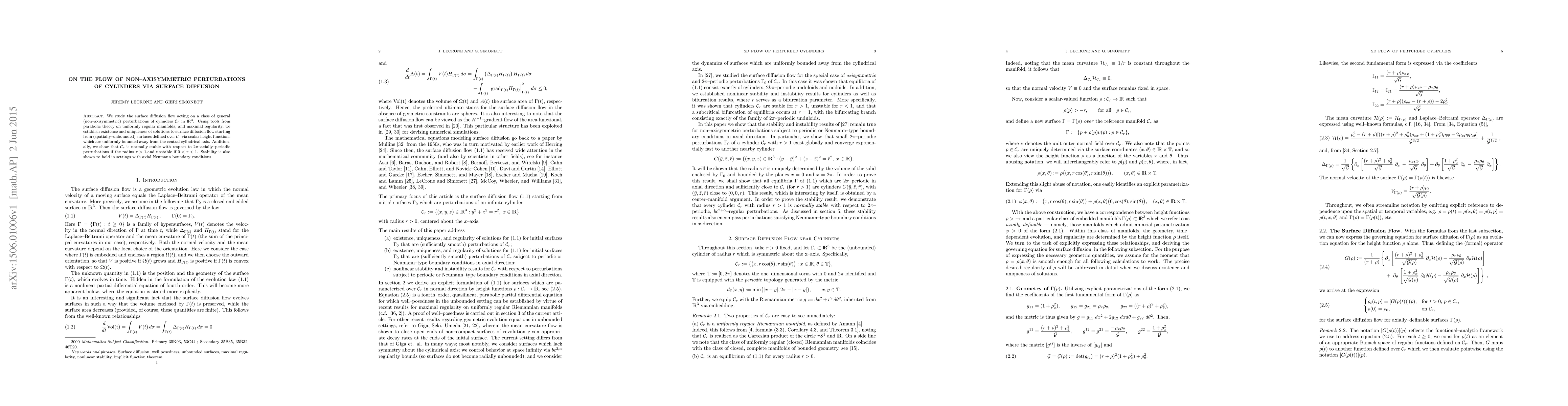 We study the surface diffusion flow acting on a class of general (non--axisymmetric) perturbations of cylinders $\mathcal{C}_r$ in ${\rm I \! R}^3$. Using tools from parabolic theory on uniformly regular manifolds, and maximal regularity, we establish existence and uniqueness of solutions to surface diffusion flow starting from (spatially--unbounded) surfaces defined over $\mathcal{C}_r$ via scalar height functions which are uniformly bounded away from the central cylindrical axis. Additionally, we show that $\mathcal{C}_r$ is normally stable with respect to $2 \pi$--axially--periodic perturbations if the radius $r > 1$,and unstable if $0 < r < 1$. Stability is also shown to hold in settings with axial Neumann boundary conditions.