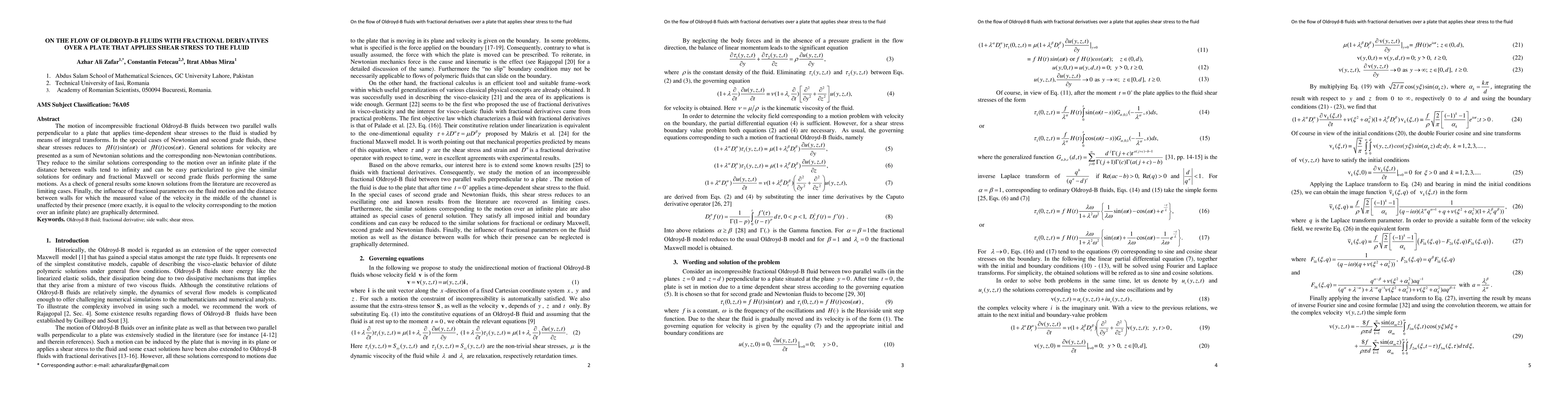 Researchers studied the flow of Oldroyd-B fluids with fractional derivatives over a plate subjected to time-dependent shear stresses, finding general solutions for velocity that can be easily particularized to ordinary and fractional Maxwell or second-grade fluids.