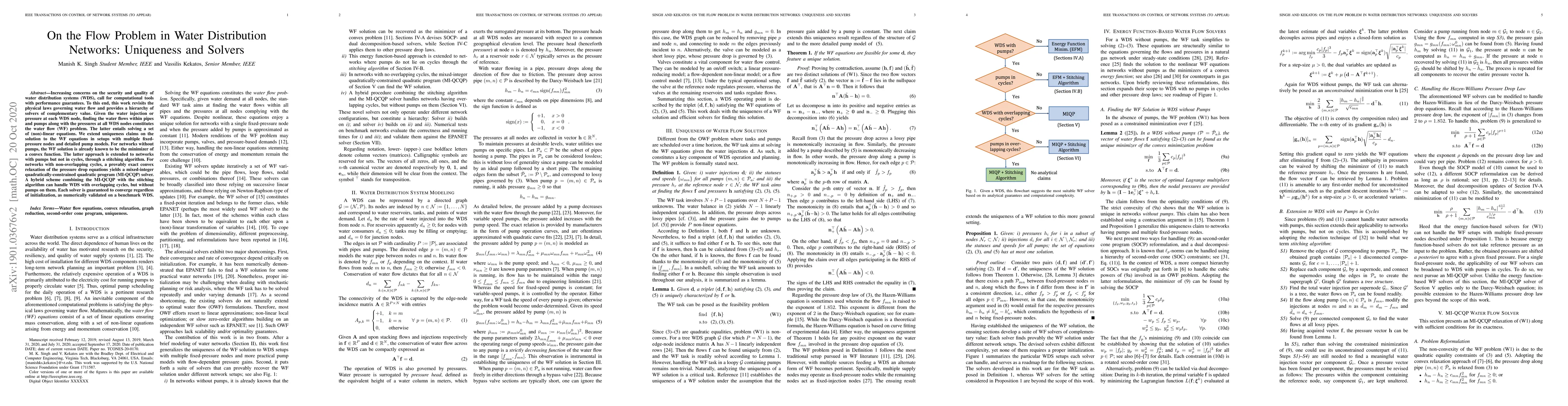 Increasing concerns on the security and quality of water distribution systems (WDS), call for computational tools with performance guarantees. To this end, this work revisits the physical laws governing water flow and provides a hierarchy of solvers of complementary value. Given the water injection or pressure at each WDS node, finding the water flows within pipes and pumps along with the pressures at all WDS nodes constitutes the water flow (WF) problem. The latter entails solving a set of (non)-linear equations. We extend uniqueness claims on the solution to the WF equations in setups with multiple fixed-pressure nodes and detailed pump models. For networks without pumps, the WF solution is already known to be the minimizer of a convex function. The latter approach is extended to networks with pumps but not in cycles, through a stitching algorithm. For networks with non-overlapping cycles, a provably exact convex relaxation of the pressure drop equations yields a mixed-integer quadratically-constrained quadratic program (MI-QCQP) solver. A hybrid scheme combining the MI-QCQP with the stitching algorithm can handle WDS with overlapping cycles, but without pumps on them. Each solver is guaranteed to converge regardless of initialization, as numerically validated on a benchmark WDS.