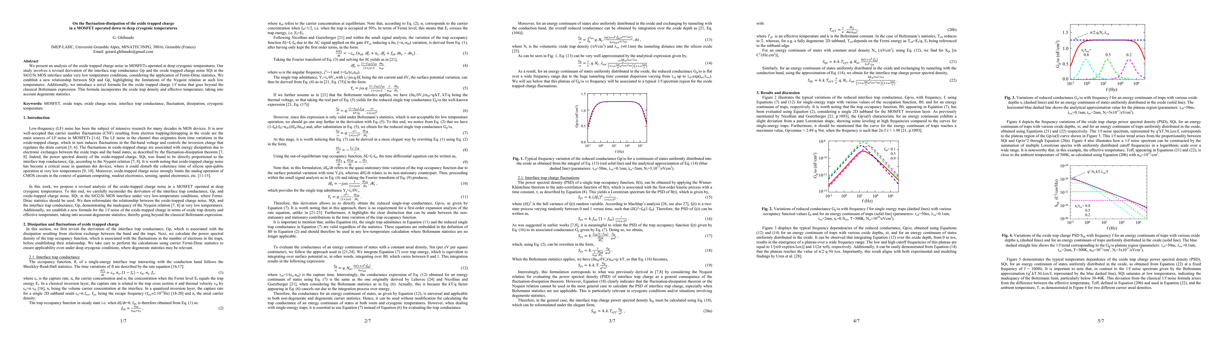 This paper analyzes oxide trapped charge noise in MOSFETs at cryogenic temperatures, proposing a new relation between oxide trapped charge noise and interface trap conductance, and developing a novel formula for 1/f noise that accounts for Fermi-Dirac statistics at low temperatures.