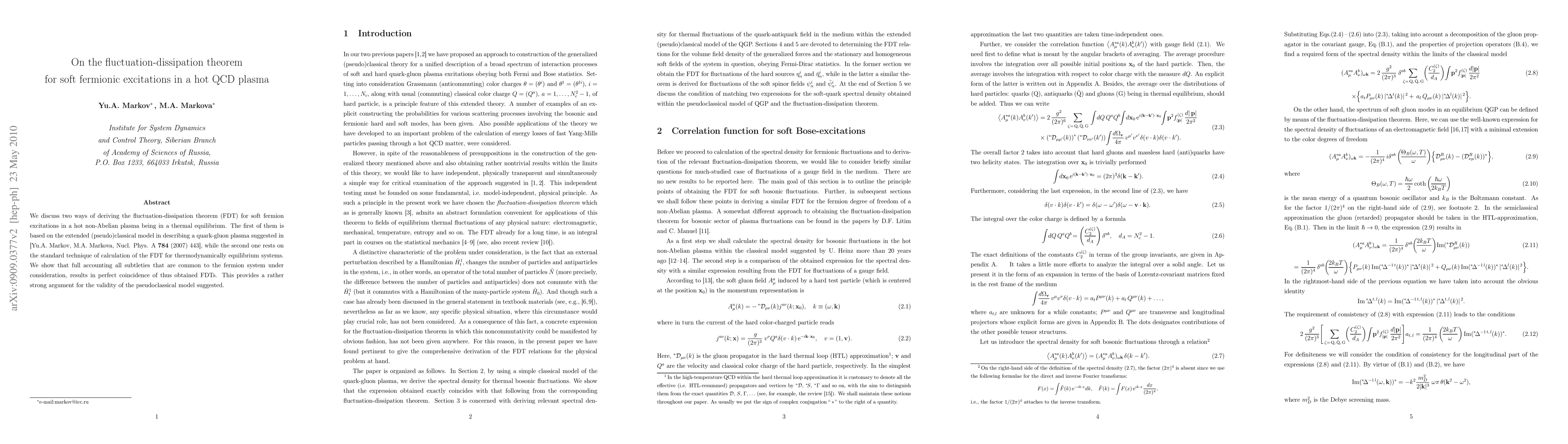 We discuss two ways of deriving the fluctuation-dissipation theorem (FDT) for soft fermion excitations in a hot non-Abelian plasma being in a thermal equilibrium. The first of them is based on the extended (pseudo)classical model in describing a quark-gluon plasma suggested in [Yu.A. Markov, M.A. Markova, Nucl. Phys. A {\bf 784} (2007) 443], while the second one rests on the standard technique of calculation of the FDT for thermodynamically equilibrium systems. We show that full accounting all subtleties that are common to the fermion system under consideration, results in perfect coincidence of thus obtained FDTs. This provides a rather strong argument for the validity of the pseudoclassical model suggested.