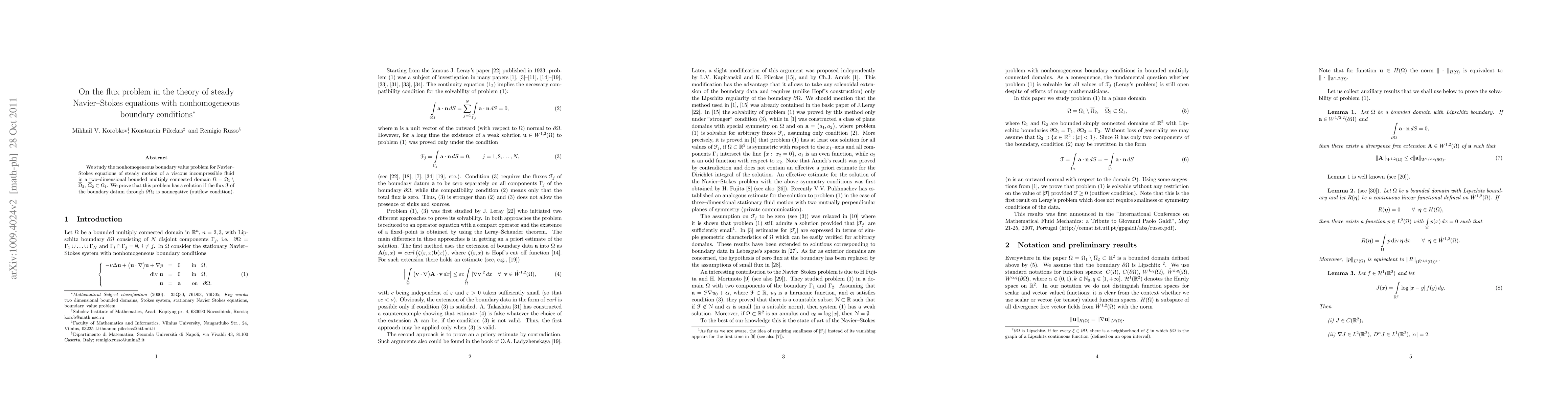 Summary: This paper investigates the nonhomogeneous boundary value problem for steady Navier-Stokes equations in a two-dimensional multiply connected domain, proving the existence of a solution when the flux through a specific boundary is nonnegative. The proof leverages the Bernoulli law for weak Euler solutions and the one-sided maximum principle.