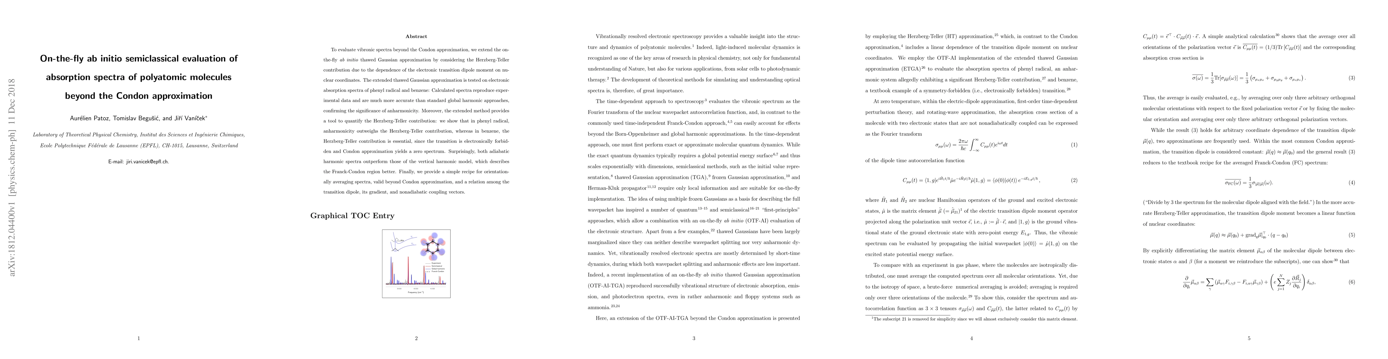 To evaluate vibronic spectra beyond the Condon approximation, we extend the on-the-fly ab initio thawed Gaussian approximation by considering the Herzberg-Teller contribution due to the dependence of the electronic transition dipole moment on nuclear coordinates. The extended thawed Gaussian approximation is tested on electronic absorption spectra of phenyl radical and benzene: Calculated spectra reproduce experimental data and are much more accurate than standard global harmonic approaches, confirming the significance of anharmonicity. Moreover, the extended method provides a tool to quantify the Herzberg-Teller contribution: we show that in phenyl radical, anharmonicity outweighs the Herzberg-Teller contribution, whereas in benzene, the Herzberg-Teller contribution is essential, since the transition is electronically forbidden and Condon approximation yields a zero spectrum. Surprisingly, both adiabatic harmonic spectra outperform those of the vertical harmonic model, which describes the Franck-Condon region better. Finally, we provide a simple recipe for orientationally averaging spectra, valid beyond Condon approximation, and a relation among the transition dipole, its gradient, and nonadiabatic coupling vectors.