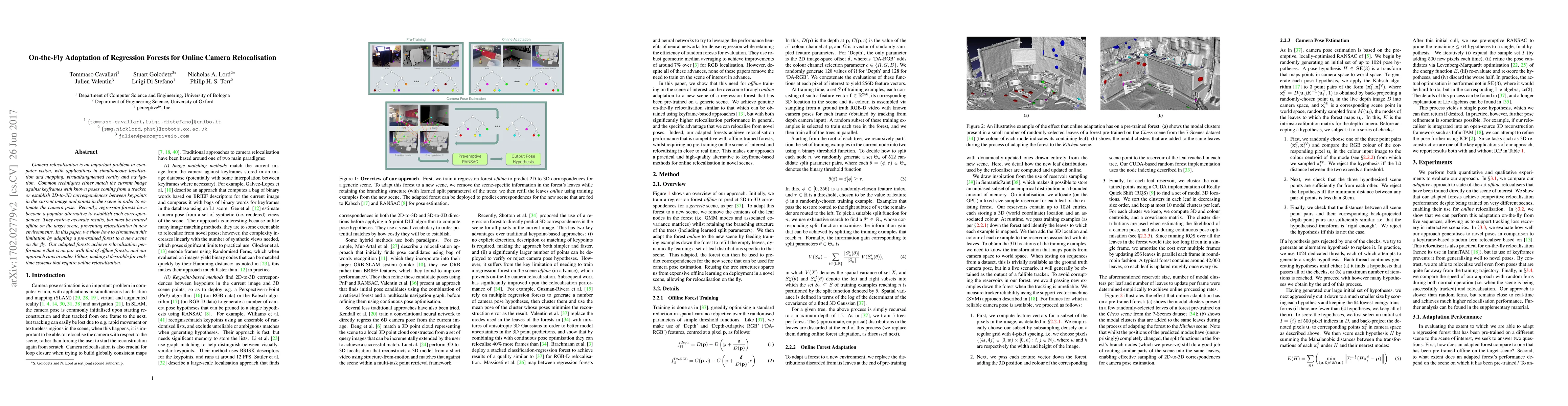 This paper presents a method for on-the-fly adaptation of regression forests to enable online camera relocalisation in new environments, achieving performance comparable to offline training while running in under 150ms for real-time applications.