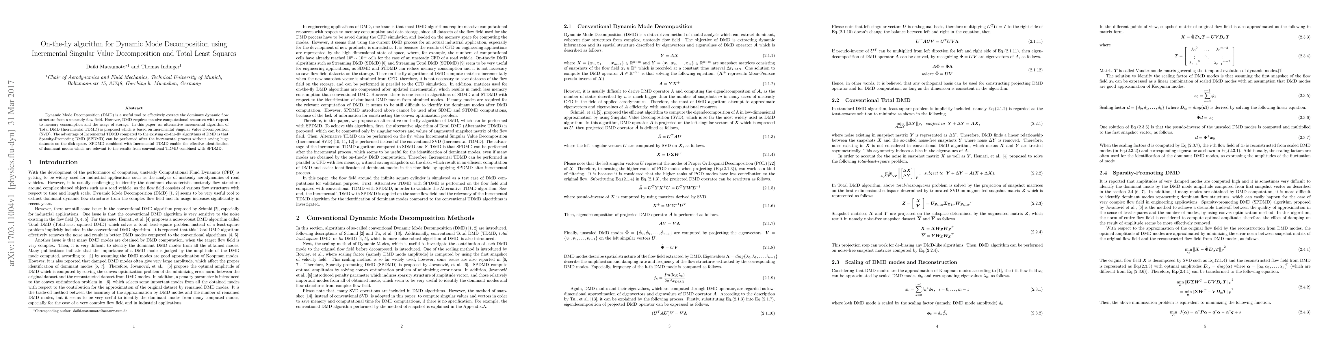 Dynamic Mode Decomposition (DMD) is a useful tool to effectively extract the dominant dynamic flow structure from a unsteady flow field. However, DMD requires massive computational resources with respect to memory consumption and the usage of storage. In this paper, an alternative incremental algorithm of Total DMD (Incremental TDMD) is proposed which is based on Incremental Singular Value Decomposition (SVD). The advantage of Incremental TDMD compared to the existing on-the-fly algorithms of DMD is that Sparsity-Promoting DMD (SPDMD) can be performed after the incremental process without saving huge datasets on the disk space. SPDMD combined with Incremental TDMD enable the effective identification of dominant modes which are relevant to the results from conventional TDMD combined with SPDMD.