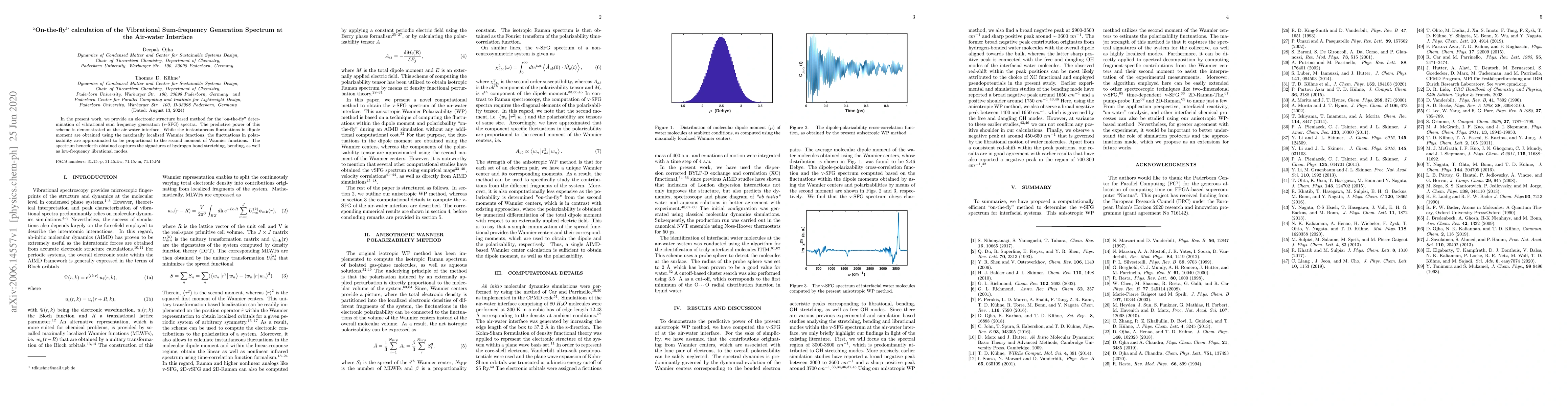 In the present work, we provide an electronic structure based method for the "on-the-fly" determination of vibrational sum frequency generation (v-SFG) spectra. The predictive power of this scheme is demonstrated at the air-water interface. While the instantaneous fluctuations in dipole moment are obtained using the maximally localized Wannier functions, the fluctuations in polarizability are approximated to be proportional to the second moment of Wannier functions. The spectrum henceforth obtained captures the signatures of hydrogen bond stretching, bending, as well as low-frequency librational modes.