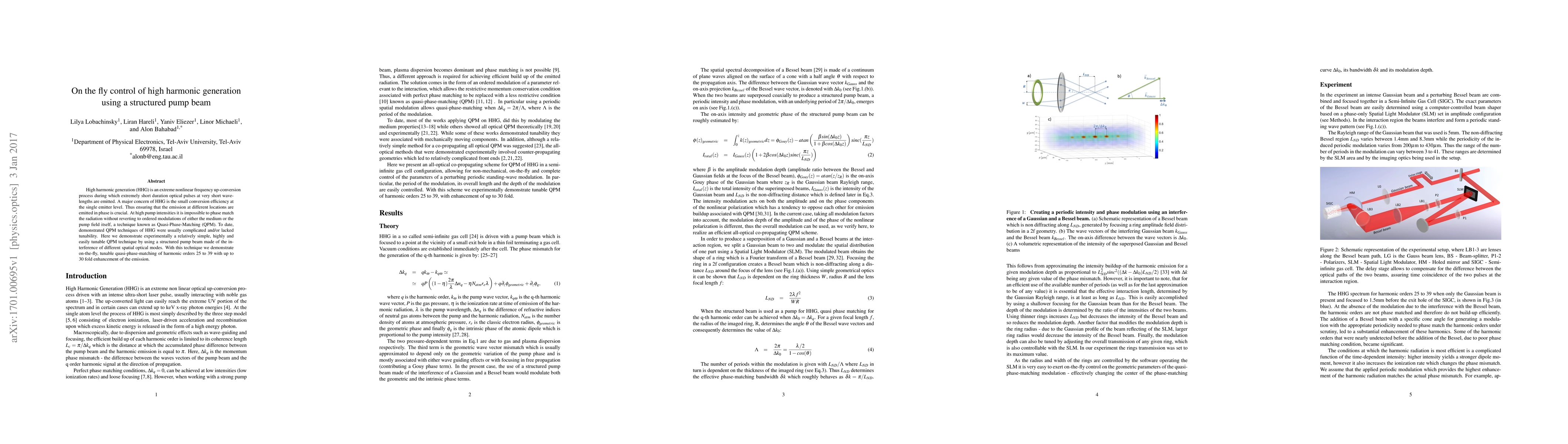 High harmonic generation (HHG) is an extreme nonlinear frequency up-conversion process during which extremely short duration optical pulses at very short wavelengths are emitted. A major concern of HHG is the small conversion efficiency at the single emitter level. Thus ensuring that the emission at different locations are emitted in phase is crucial. At high pump intensities it is impossible to phase match the radiation without reverting to ordered modulations of either the medium or the pump field itself, a technique known as Quasi-Phase-Matching (QPM). To date, demonstrated QPM techniques of HHG were usually complicated and/or lacked tunability. Here we demonstrate experimentally a relatively simple, highly and easily tunable QPM technique by using a structured pump beam made of the interference of different spatial optical modes. With this technique we demonstrate on-the-fly, tunable quasi-phase-matching of harmonic orders 25 to 39 with up to 30 fold enhancement of the emission.