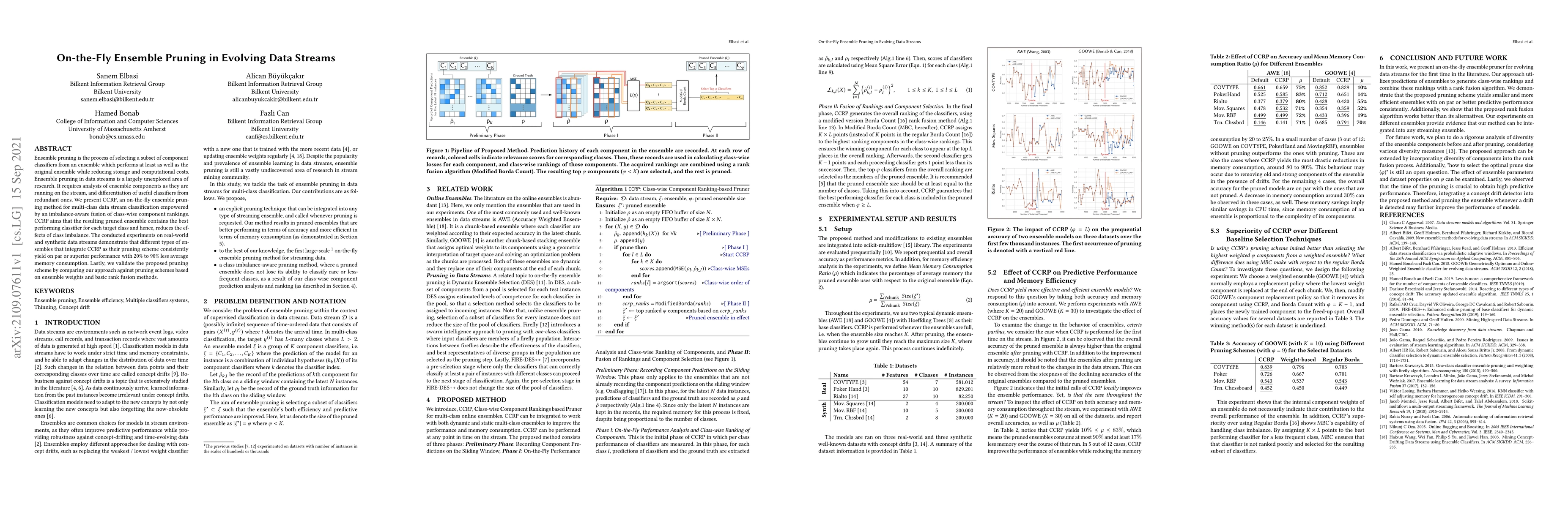 This paper introduces CCRP, an on-the-fly ensemble pruning method for multi-class data stream classification that reduces memory usage while maintaining or improving performance. Experiments show CCRP achieves comparable or better results with significantly lower memory consumption compared to other pruning techniques.