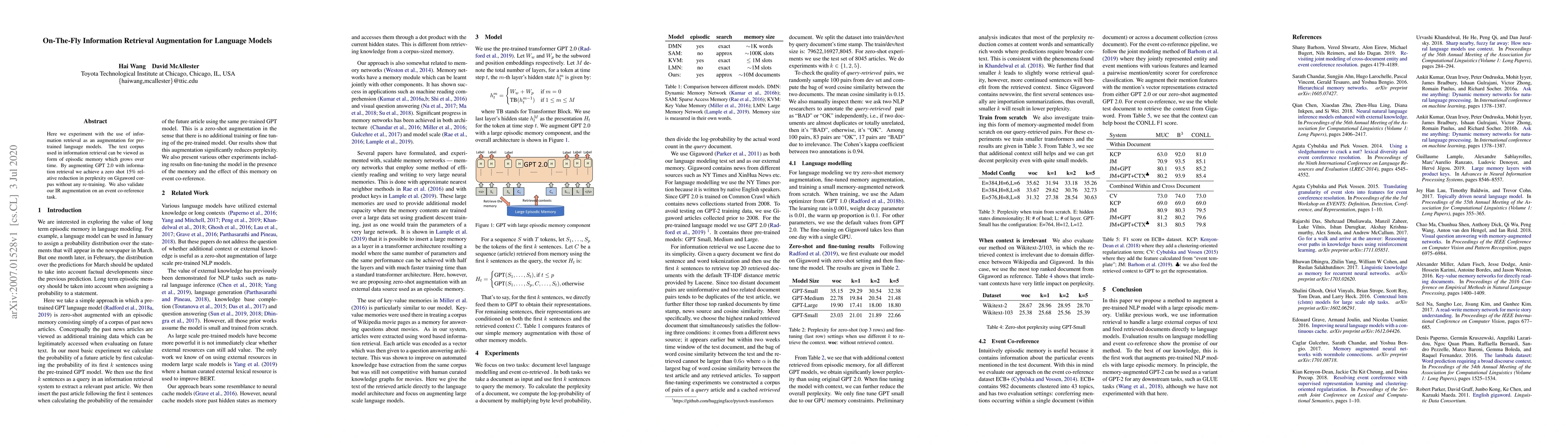 This paper explores using information retrieval to augment pre-trained language models, specifically GPT 2.0, achieving a 15% relative reduction in perplexity on the Gigaword corpus without retraining. The method also shows effectiveness in an event co-reference task.